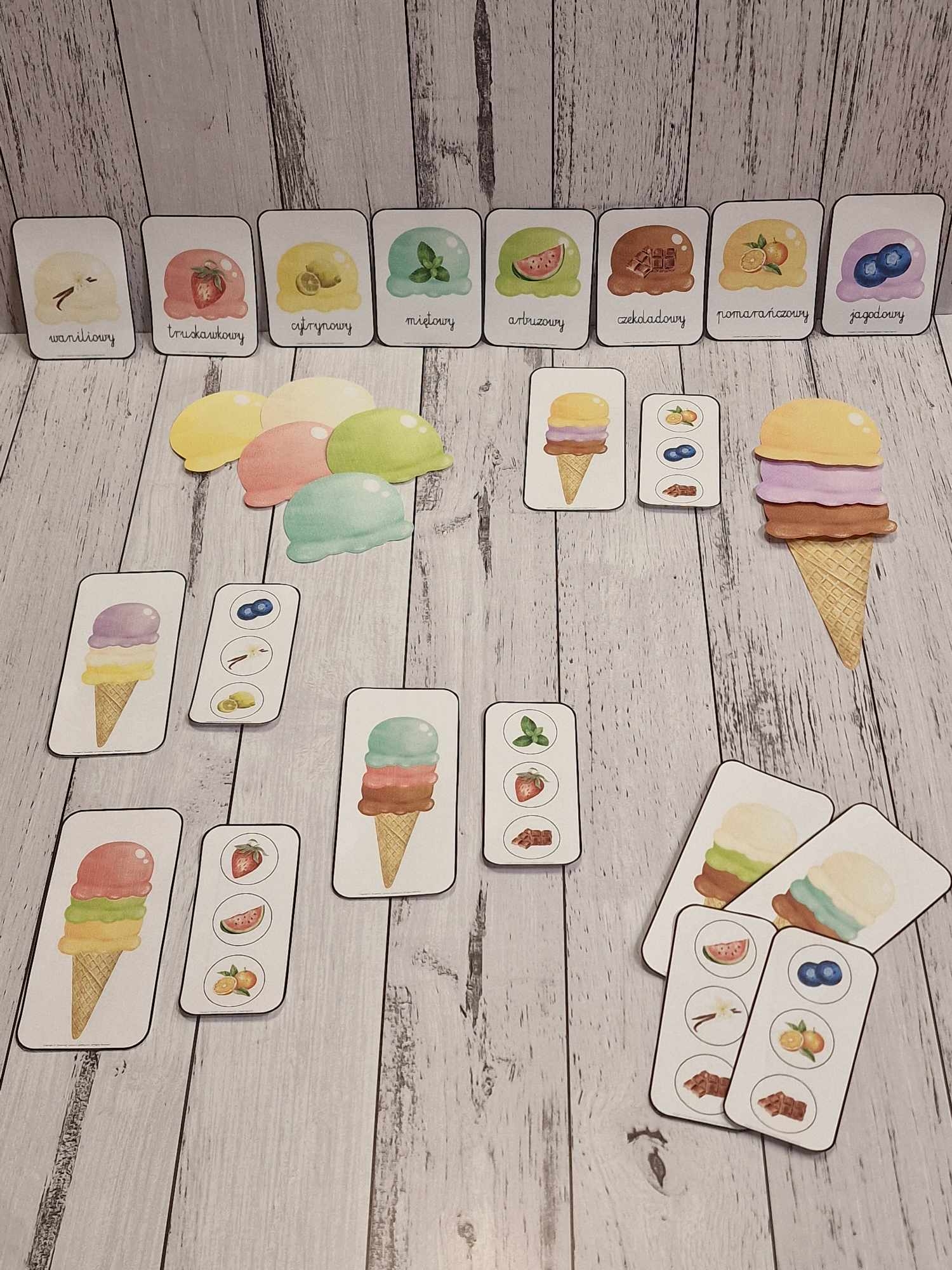 Zestaw zawiera 8 kart ze smakami, 30 kart z lodami, 30 kart z odwzorowaniem smaków, wafelek i 8 gałek lodów. Zadaniem dziecka jest odwzorowanie układu lodów zgodnych ze smakami na obrazku. Pomoc ta kształtuje umiejętność uwagi oraz koncentrację, usprawnia lewą półkulę mózgu a także ćwiczy spostrzegawczość.