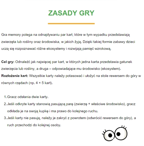 Zadbaj o rozwój pamięci i wiedzy przyrodniczej w jednym! Prezentujemy wyjątkową grę memory, w której dzieci i dorośli odkrywają karty przedstawiające zwierzęta/rośliny oraz odpowiadające im środowiska. Zestaw zawiera 30 trwałych kart (15 par) oraz proste zasady gry, dzięki którym rozgrywka jest przyjemna i jednocześnie edukacyjna.