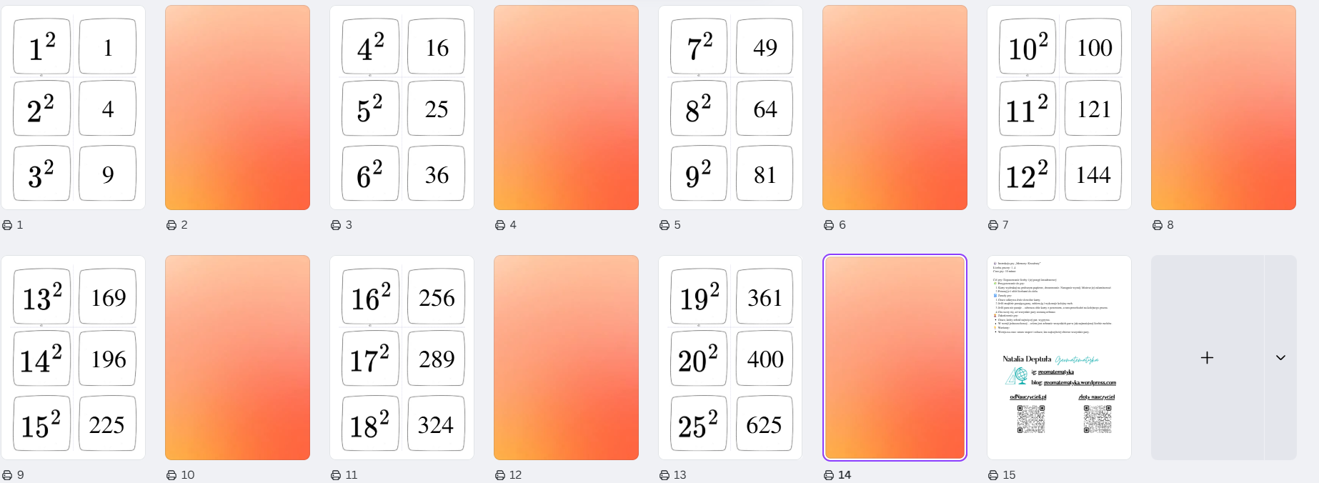 ✔️ Karty z liczbami i ich kwadratami