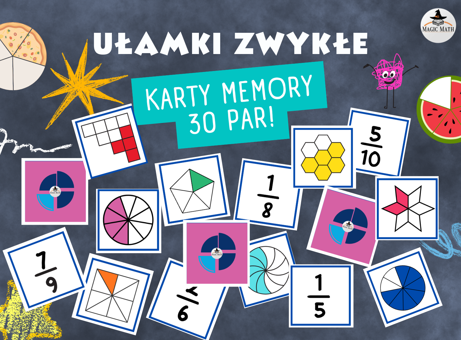 Ten materiał to praktyczne, angażujące narzędzie do pracy z ułamkami zwykłymi, które sprawdzi się zarówno na lekcji, jak i na zajęciach utrwalających czy zastępstwach. Karty łączą czytelne, atrakcyjne rysunki z zapisem ułamków, dzięki czemu uczniowie nie tylko rozpoznają ułamki, ale przede wszystkim rozumieją ich sens.