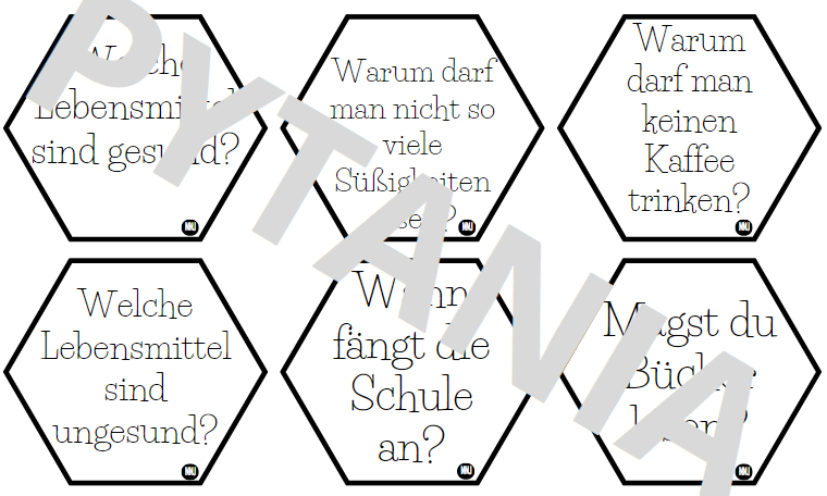 Gra na lekcję języka niemieckiego. Karty zawierają 144 pytania. Gra może być wykorzystana na początku, w przerwie lub na końcu lekcji. Doskonale przyda się na zastępstwa lub w trakcie powtórek do egzaminu ósmoklasisty. Uczniowie mogą losować pytania i zapisywać odpowiedzi na tablicy bądź w zeszycie, tworząc krótkie dialogi, reakcje językowe.