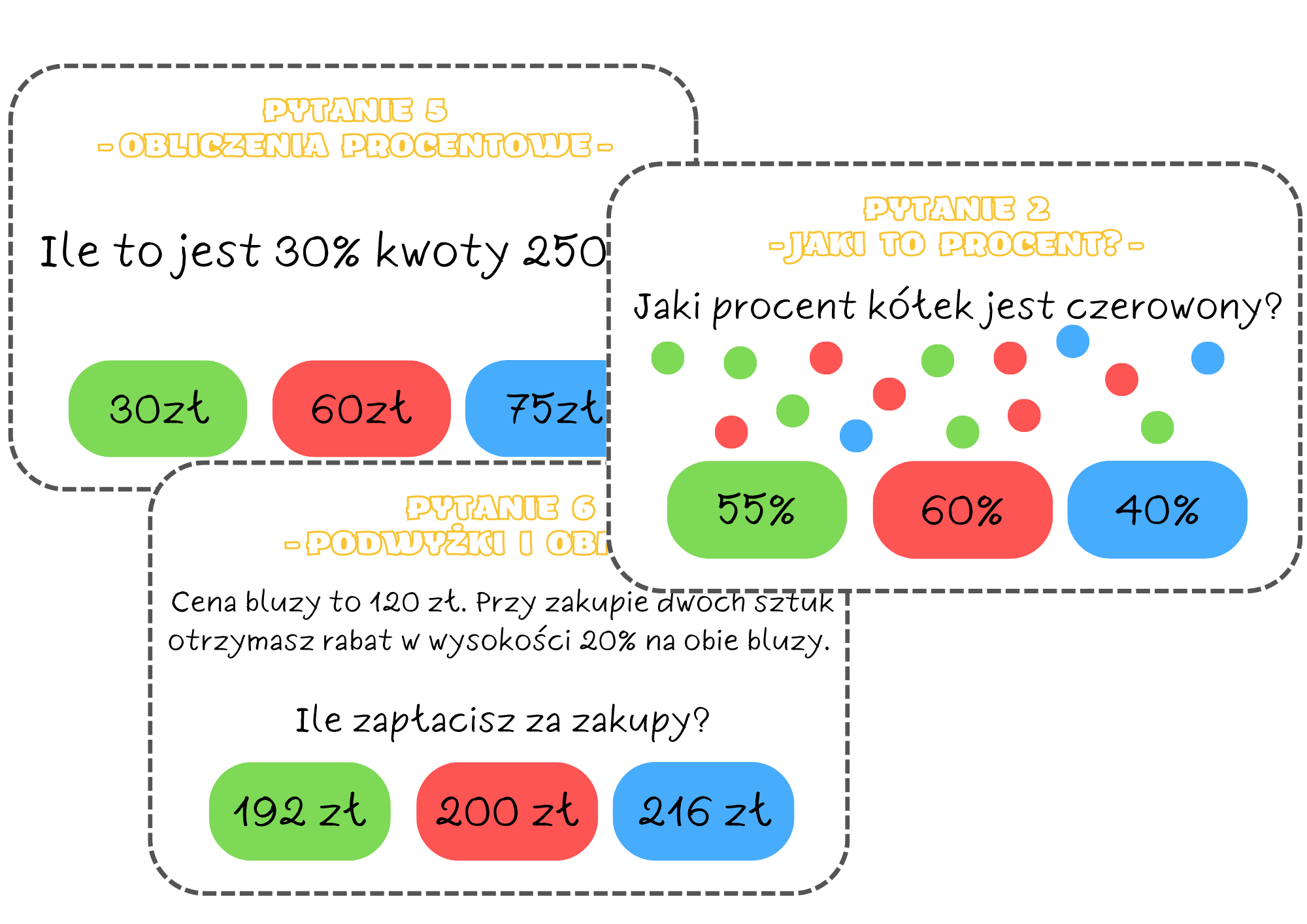 Zakres materiału obejmuje tematy: procenty a ułamki, obliczenia procentowe, obliczanie procentu z liczby, podwyżki i obniżki.