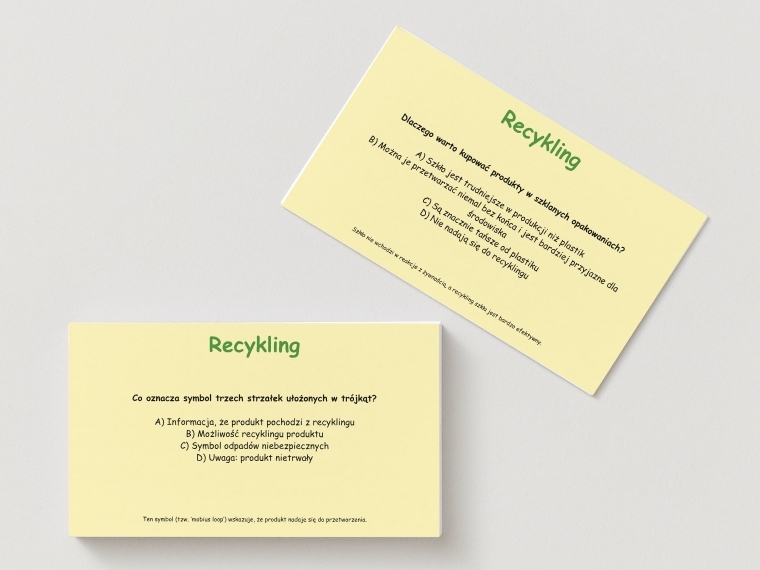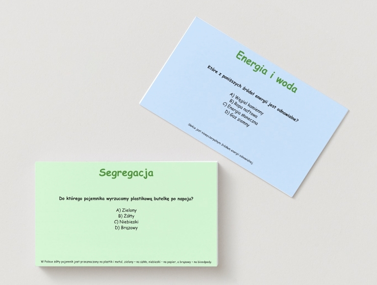 - Aż 40 kart podzielonych na 4 kategorie, każda z własnym kolorem tła (Segregacja, Energia i Woda, Recykling, Ciekawostki).