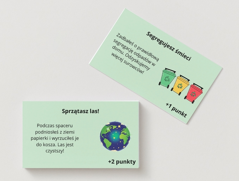Gracze przesuwają pionki po planszy, starając się dotrzeć do mety z jak największą liczbą punktów. Pola dodatnie nagradzają za takie działania jak segregacja śmieci, oszczędzanie wody czy energii, a pola ujemne uczą, jak unikać marnotrawstwa czy nadmiaru plastiku. Emocji dodają karty zdarzeń, które mogą zupełnie odwrócić losy rozgrywki!
