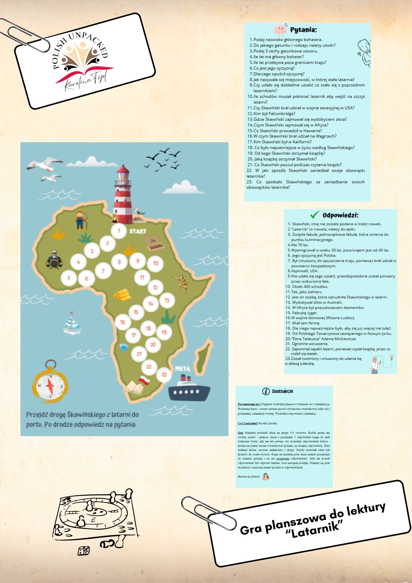 🧩 Planszę do gry + osobną planszę z pytaniami do lektury.