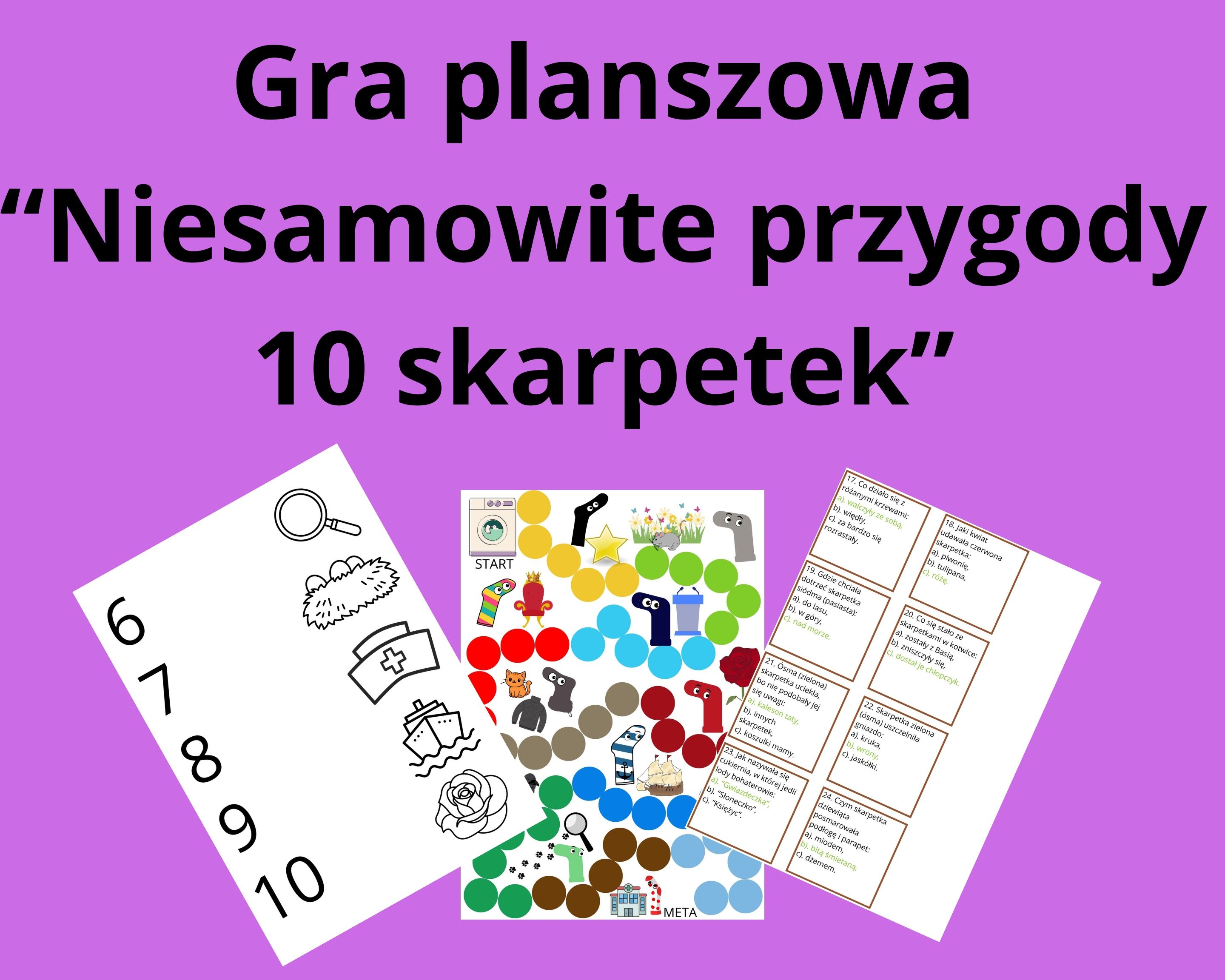 Gra planszowa do wydrukowania i wycięcia, zawiera plansze, instrukcję i 30 pytań testowych, dotyczących treści lektury + kartę pracy, w której uczeń ma narysować skarpetkę i połączyć ją z odpowiednią grafiką