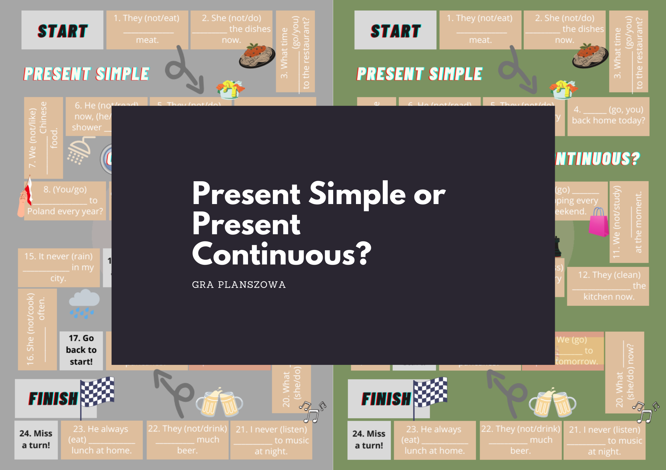 Gra planszowa PRESENT SIMPLE or PRESENT CONTINUOUS w dwóch wersjach kolorystycznych - gra jest uniwersalna, można wykorzystać ją do ćwiczenia czasów w młodszych klasach lub do powtórek dla klasy 8. Jeśli zalaminujemy, posłuży nam wieki. :)