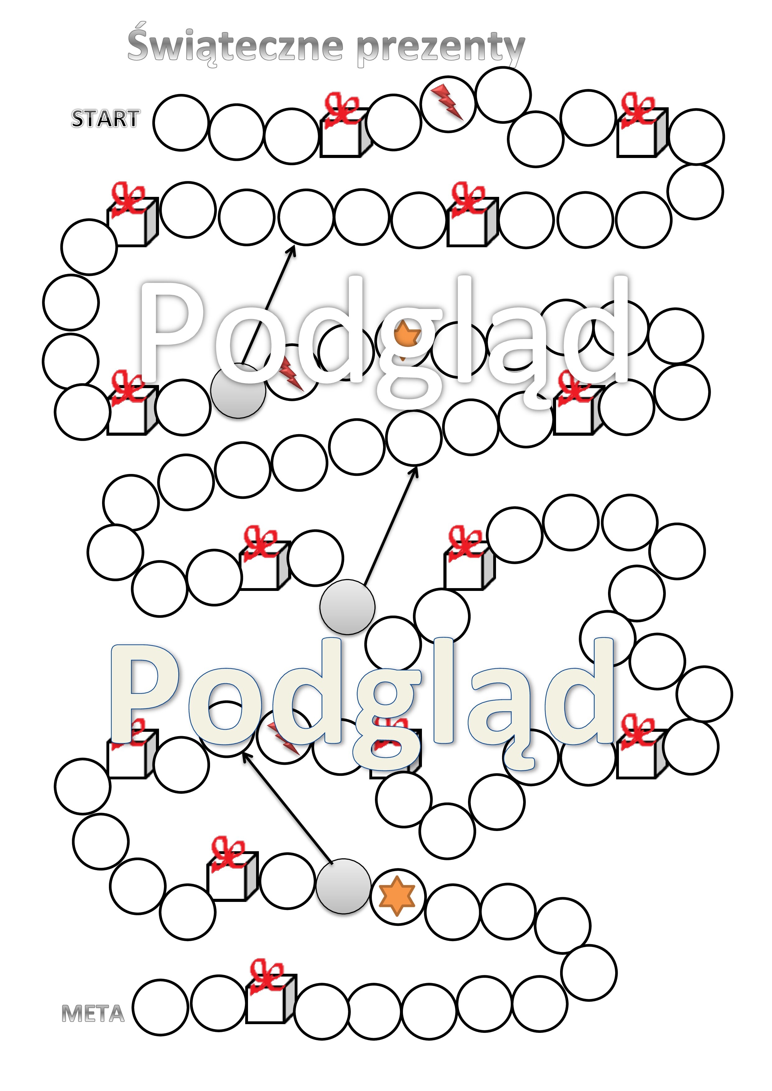 Gra planszowa przeznaczona dla 2-3 osób. Do gry potrzebne są kredki (po jednej dla każdego uczestnika, pionki i kostka). Uczestnicy przesuwają się zgodnie z wyrzuconą liczbą oczek. Jeśli trafią na pole z prezentem, kolorują swoją kredką. Wygrywa uczestnik, który zebrał najwięcej prezentów. Po drodze są przeszkody. Szczegółowe zasady opisane są na drugiej stronie gry. Miłej zabawy:)