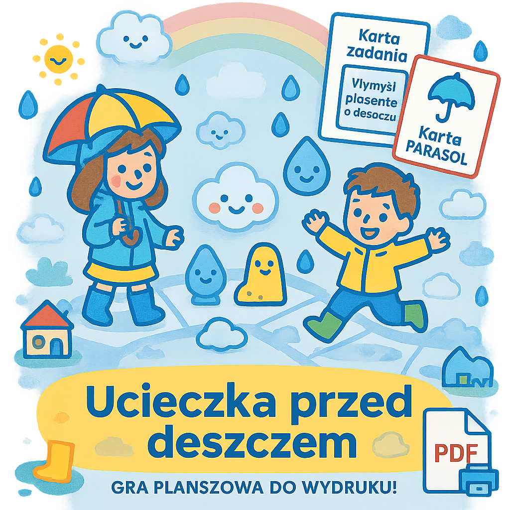 Poznaj „UCIECZKĘ PRZED DESZCZEM” — wyjątkową grę planszową do wydruku, która sprawdzi się w szkole, przedszkolu i podczas rodzinnych spotkań! 👧🧒