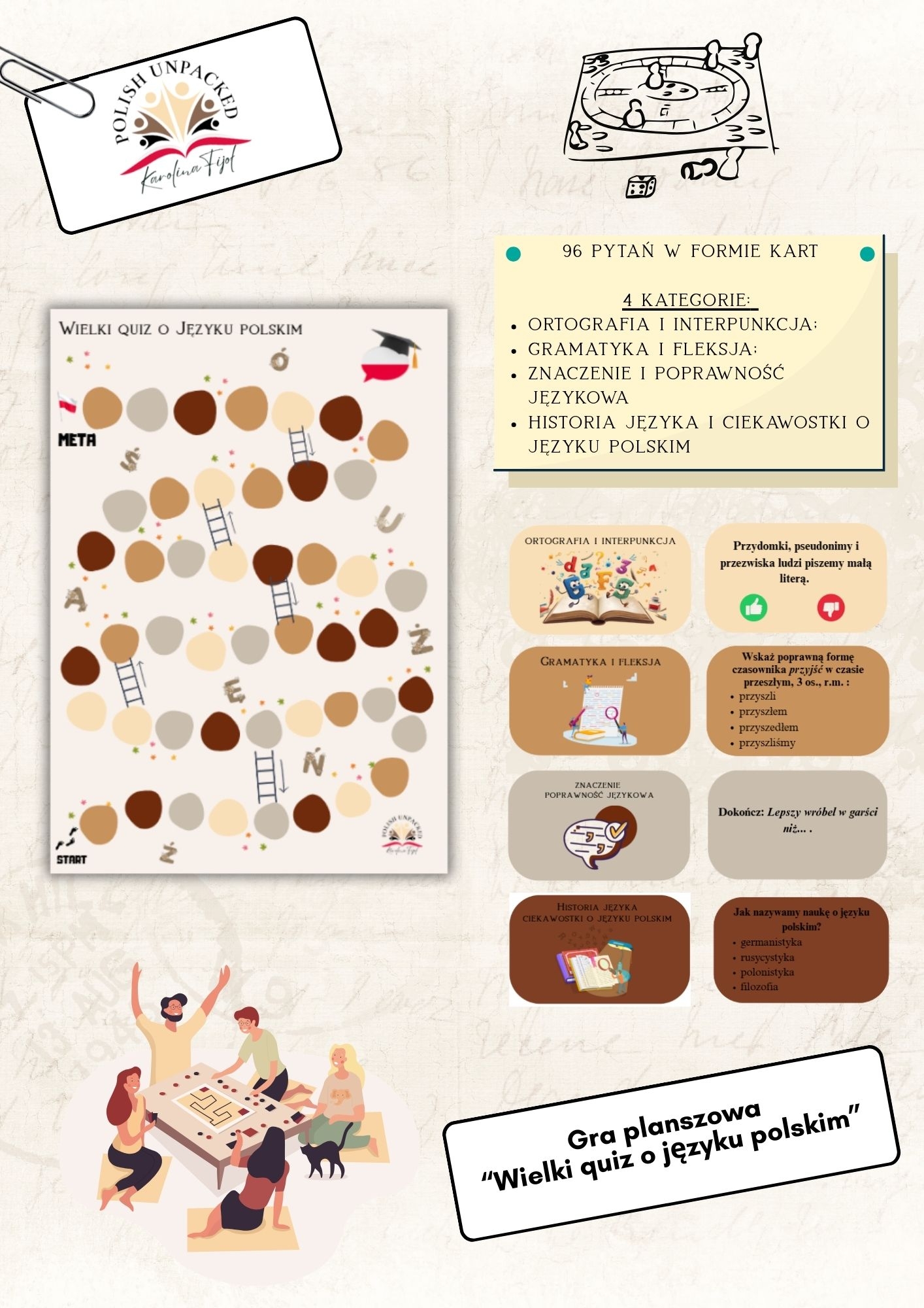 „Wielki quiz o języku polskim” to gra planszowa, która pozwala uczniom klas 4-8 w zabawny i wciągający sposób utrwalić wiedzę z zakresu języka polskiego.