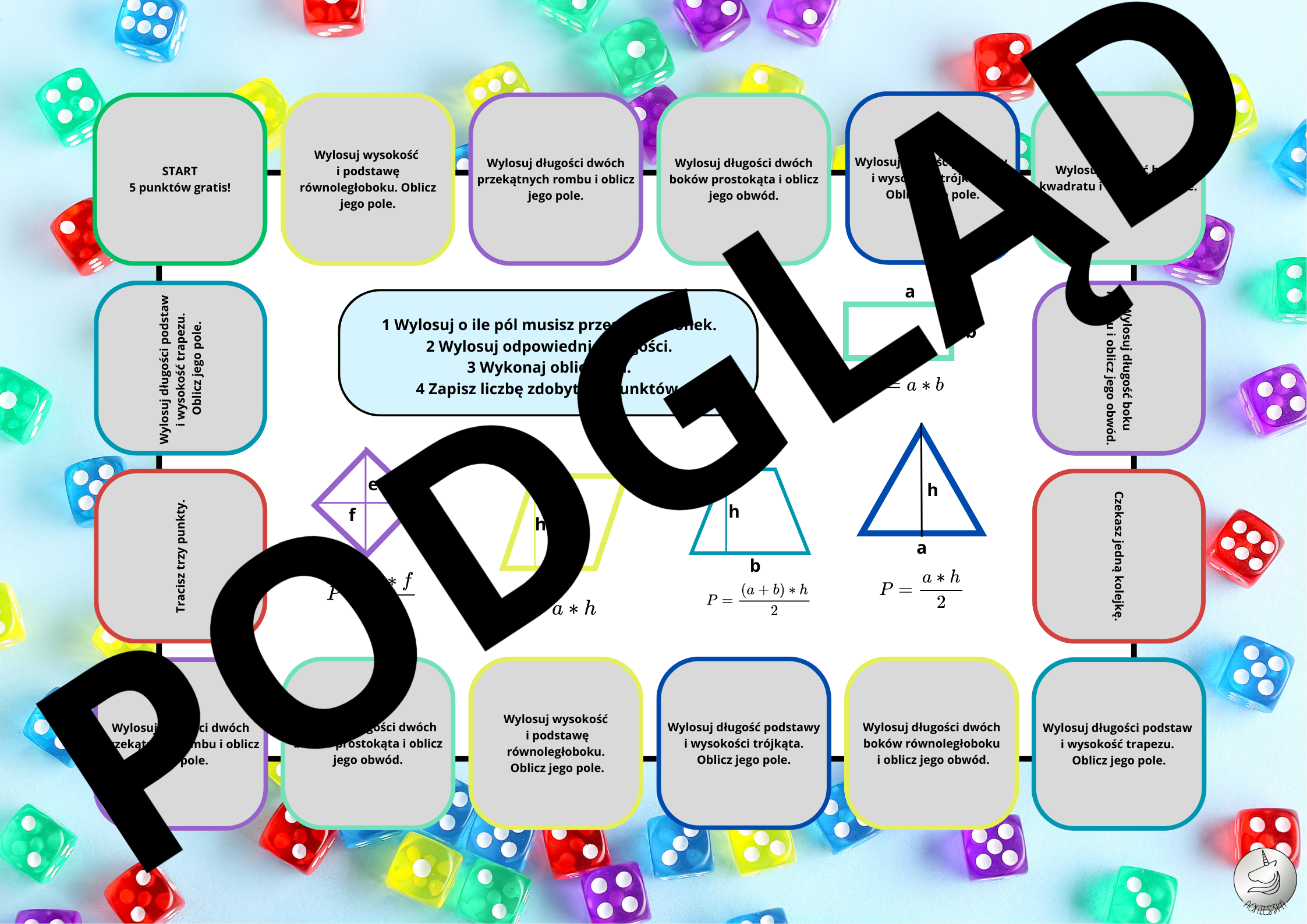 Gra dydaktyczna dla uczniów szkoły podstawowej. Uczniowie turlają kostką, chodzą po planszy i muszą wyturlać odpowiednie długości, aby obliczyć pole. Gra pomaga powtórzyć obliczanie pól trójkątów, kwadratów, prostokątów, trapezów, równoległoboków i rombów.