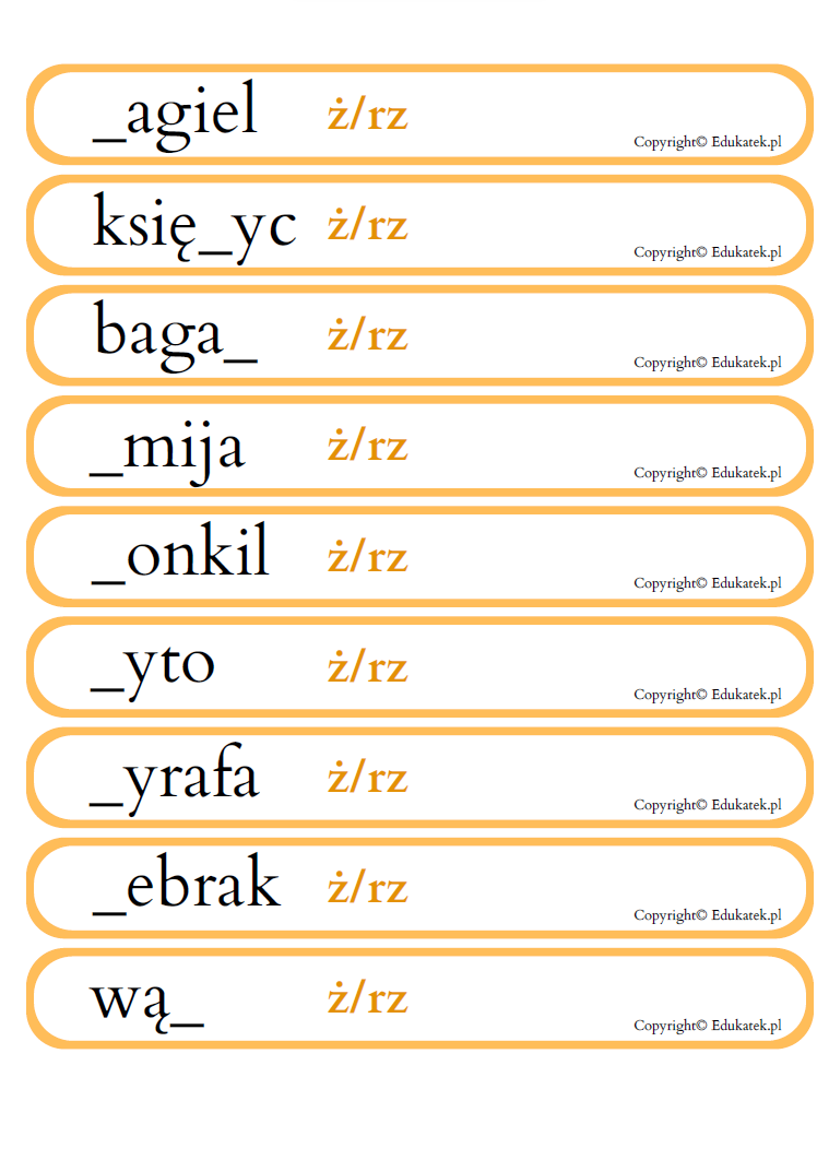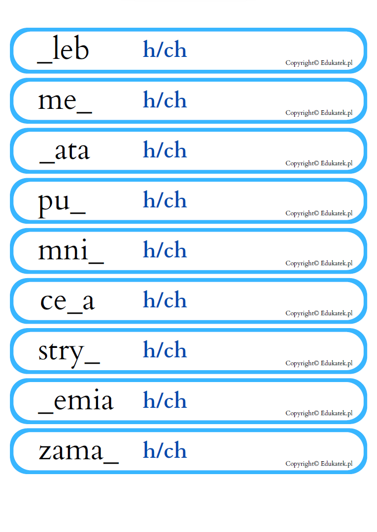 Karty drukujemy na sztywnych kartkach lub laminujemy. Paski z wyrazami oraz symbolami dodatkowymi rozcinamy, a następnie wrzucamy do kubka wyrazami i symbolami do dołu. Dzieci po kolei losują pasek oraz uzupełniają wyraz właściwą literą. W zestawie znajdują się paski z 3 trudnościami ortograficznymi (h/ch - kolor niebieski, ó/u - kolor zielony, ż/rz - kolor pomarańczowy). Za prawidłową odpowiedź dziecko zostawia pasek, natomiast za błędną odkłada go do kubka.