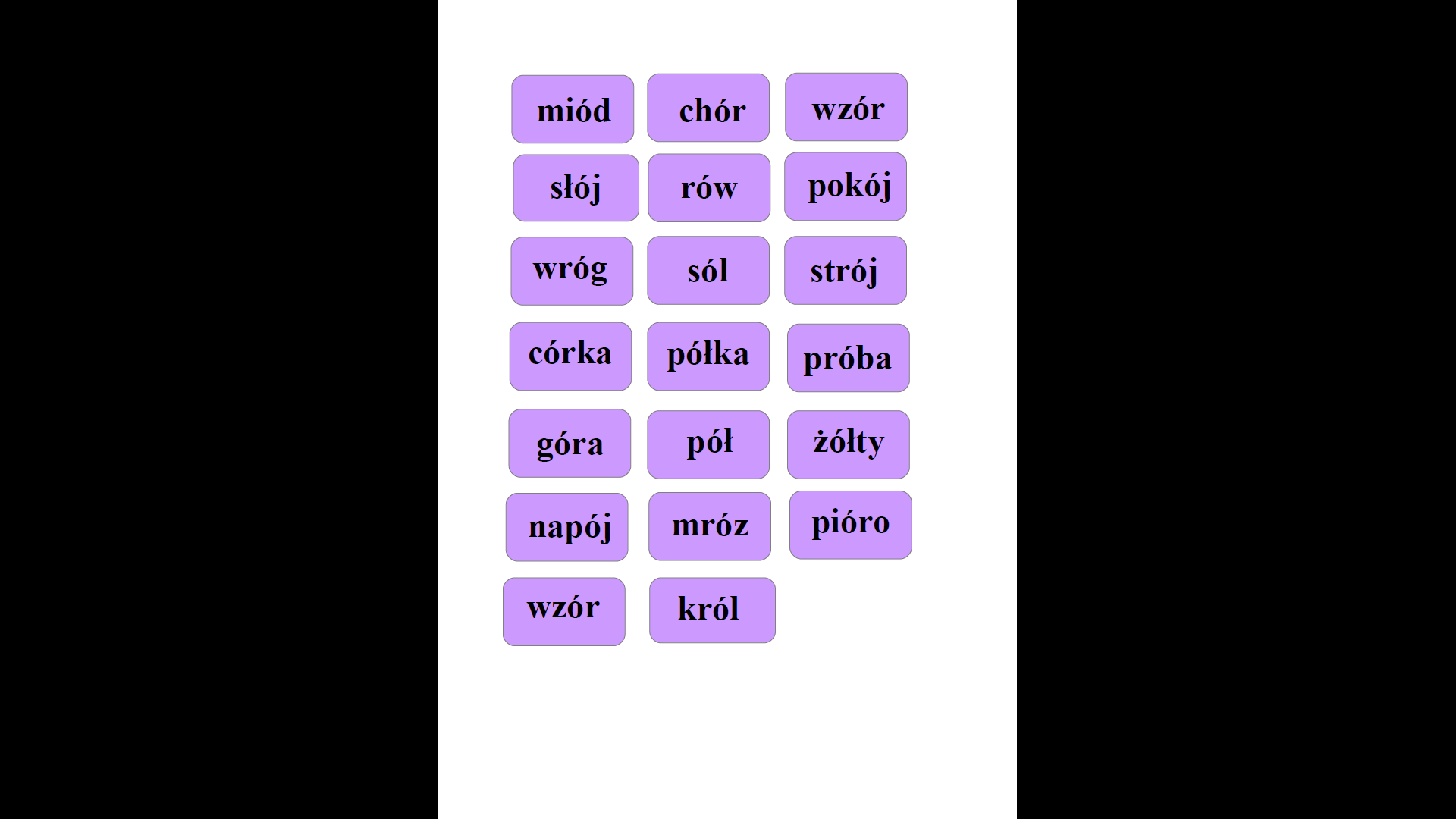 W skład zestawu wchodzi 120 kartoników z wyrazami (20x”ż”, 20x”rz”, 20x”ó”, 20x”u”, 20x”h”, 20x”ch”). Kartoniki należy wydrukować dwukrotnie. Nauczyciel, rodzic decyduje ile kart jest w grze i jakie wyrazy są utrwalane (dla ułatwienia każda trudność ma inny kolor). Zestaw zawiera te same wyrazy co „Jesienna ortografia” (wyrazy z tego zestawu można umieścić np. na gazetkach ściennych), a po jakimś czasie wprowadzić dodatkowo memory z wykorzystaniem dokładnie tych samych wyrazów.