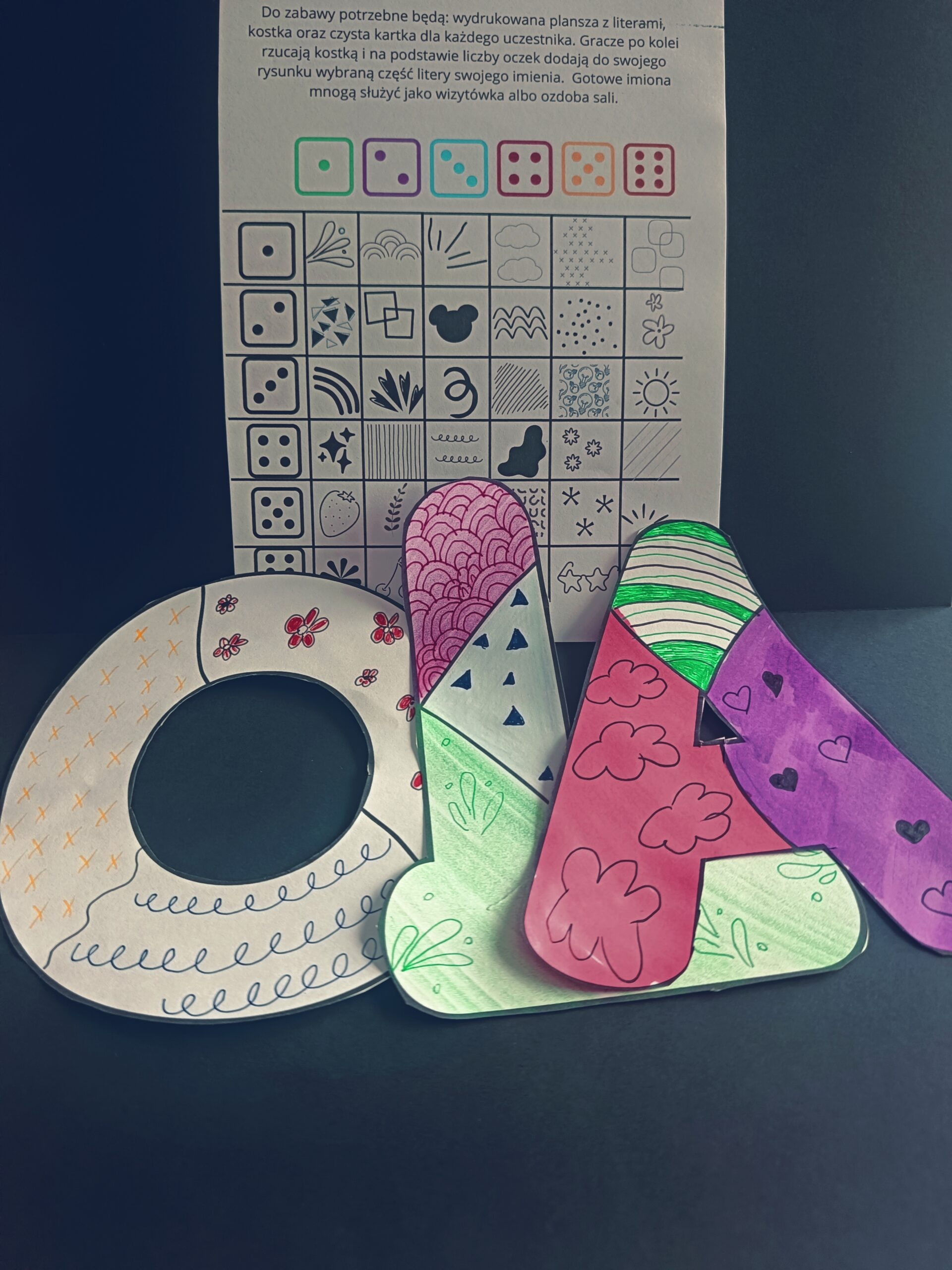 Do zabawy potrzebne będą: wydrukowana plansza z literami, kostka oraz czysta kartka dla każdego uczestnika. Gracze po kolei rzucają kostką i na podstawie liczby oczek dodają do swojego rysunku wybraną część litery swojego imienia. Gotowe imiona mnogą służyć jako wizytówka albo ozdoba sali.