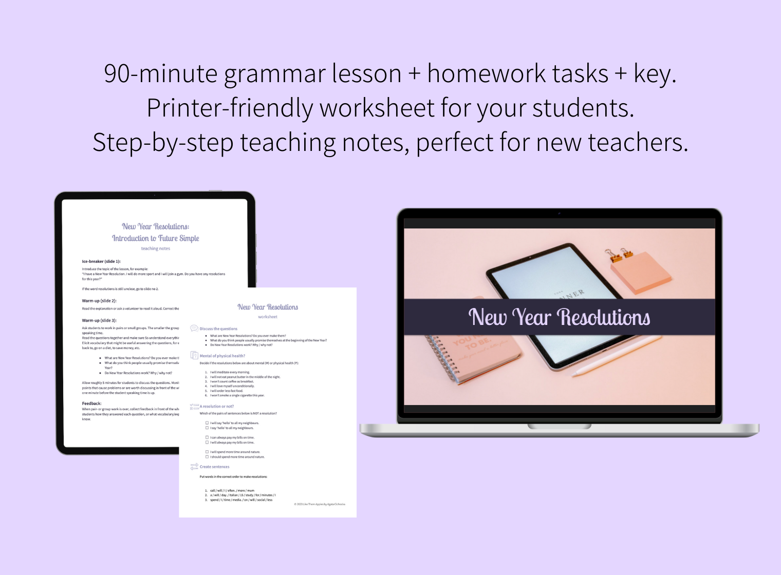 Gotowa lekcja na zajęcia z gramatyki dla dorosłych uczniów na poziomie A1-A2. Na podstawie przykłądów lekkich i zabawnych postanowień noworocznych Twoi uczniowie nauczą się: