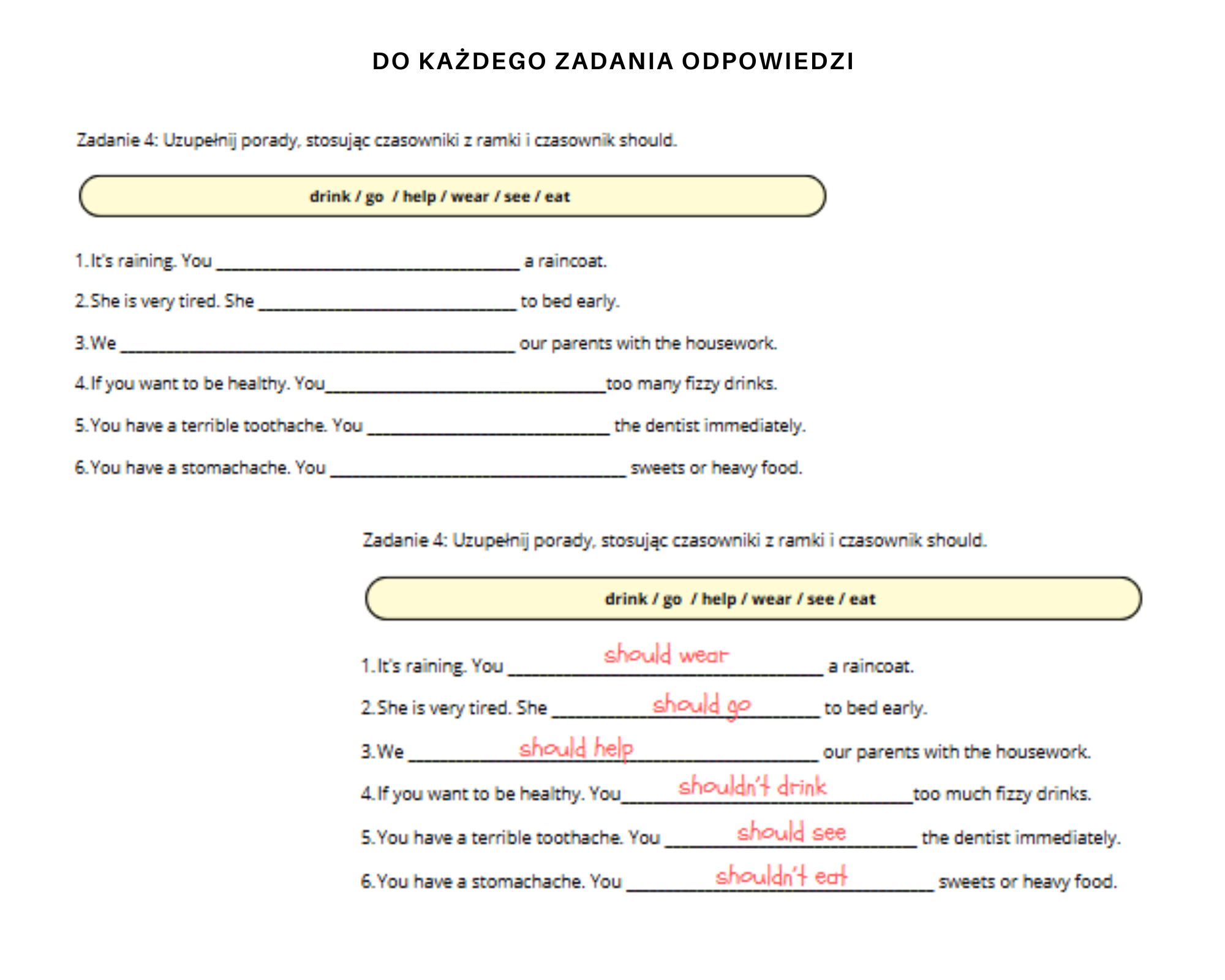 Materiał został przygotowany z myślą o uczniach szkoły podstawowej na poziomie A2, którzy chcą rozwinąć swoje umiejętności językowe w zakresie gramatyki, a w szczególności przećwiczyć użycie czasownika modalnego should oraz have to