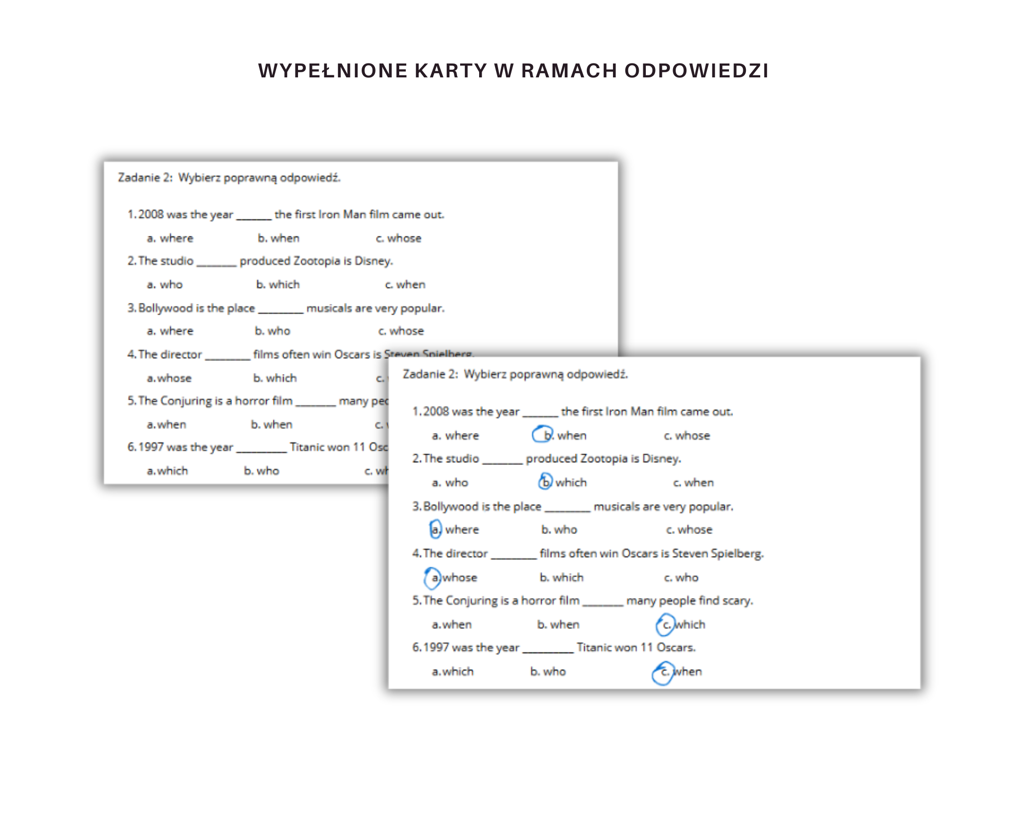 Zestaw zawiera uzupełnione karty w ramach odpowiedzi, które ułatwiają sprawdzanie wykonanych zadań, a polecenia zostały zapisane w języku polskim.