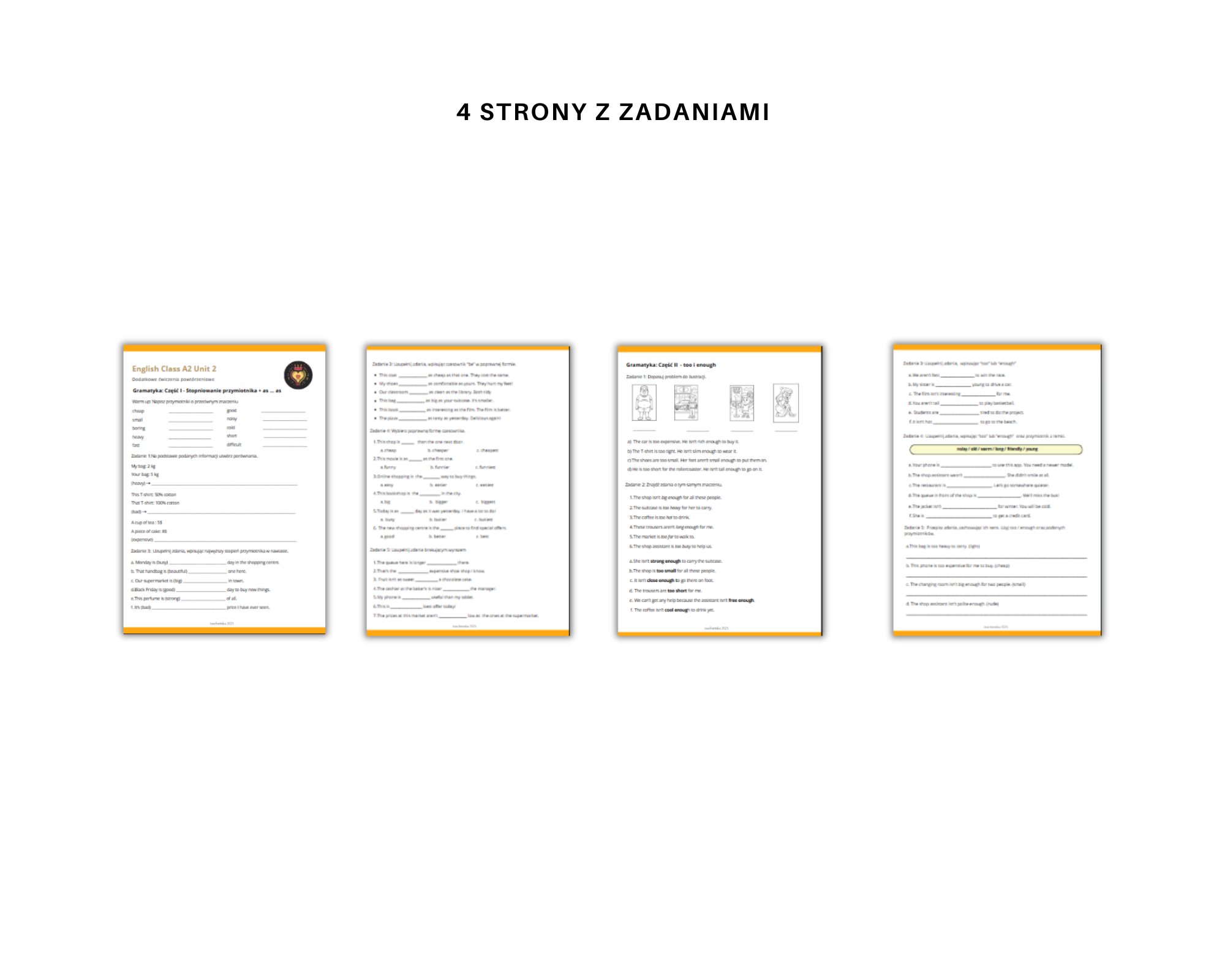Materiał został przygotowany z myślą o uczniach szkoły podstawowej na poziomie A2, którzy chcą rozwinąć swoje umiejętności językowe w zakresie gramatyki, a w szczególności przećwiczyć stopniowanie przymiotnika, zwrot as .. as oraz wyrażenia "too" i "enough". Materiał jest idealny zarówno dla osób, które chcą ugruntować swoją wiedzę, jak i dla tych, które potrzebują dodatkowego wsparcia w nauce.