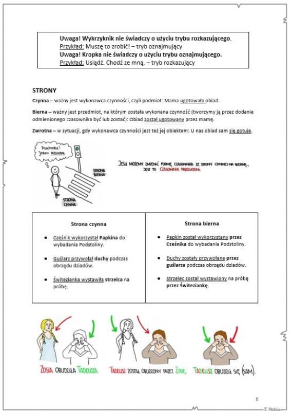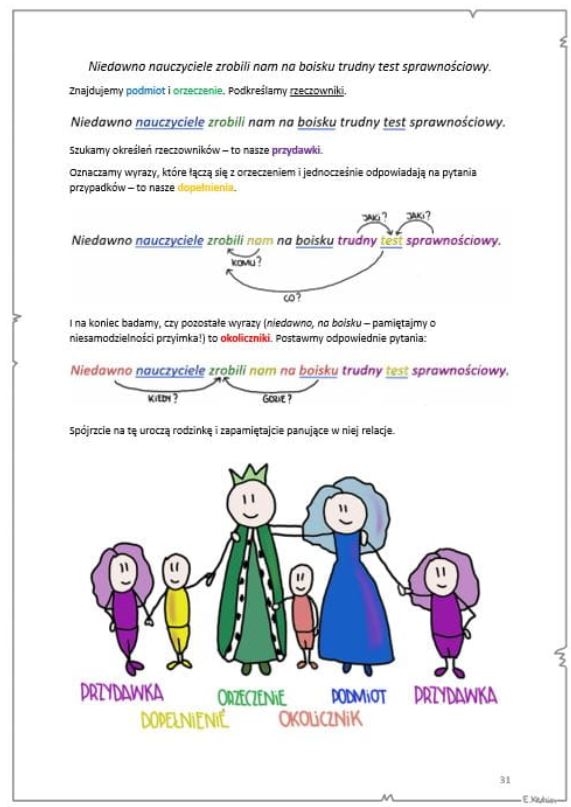 E-book został stworzony z myślą o uczniach przygotowujących się do egzaminu 8-klasisty. Wewnątrz można znaleźć sporo teorii dotyczącej części mowy, części zdania i składni, a to wszystko opatrzone przyjemnymi dla oka ilustracjami. Dodatkowo w wielu miejscach pojawiają się QR-cody odsyłające do filmów na YT przygotowanych przez autorkę.
