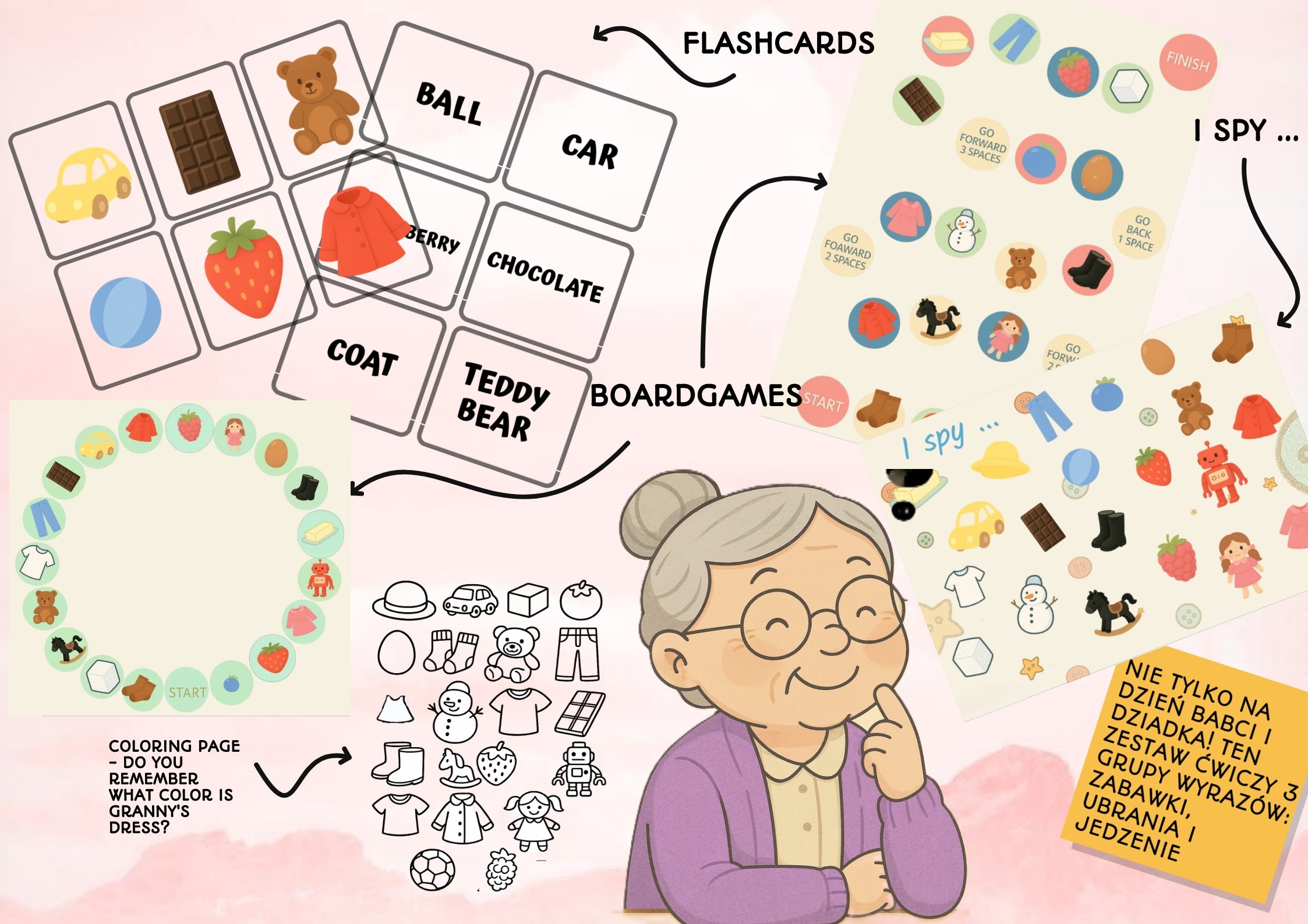 🎂 Granny Buttons poleca! Zestaw edukacyjny do nauki angielskiego dla dzieci w wieku przedszkolnym i wczesnoszkolnym 🧁 Pomóż Granny przygotować niespodziankę dla dziadka 🧠 Rozwiąż zabawne zagadki: czy w cieście są... skarpetki? 🎨 Koloruj, licz, szukaj i graj! 🎲 W zestawie: Interaktywna historyjka o Granny Buttons(15 str) , która może być wstępem do lekcji o Dniu Babci i Dziadka ale bez skupienia się tylko na temacie rodziny,. Tutaj poćwiczycie ubrania, jedzenie, zabawki, kolory a nawet liczby! Flashcards, bingo, „I spy”, kolorowanka i dwie wersje borad game pomogą wam utrwalić poznane w historyjce słownictwo. Jak korzystać z  materiałów: Babcia zapomniała składników, na każdej stronie z babcią i dymkiem, pytamy uczniow który z przedmiotów w danym kolorze może być składnikiem ciasta. Dzieci zgadują, odkrywają chmurkę i wrzucają flashcard z tym składnikiem do miski mowiąc przy tym wyliczankę :  mix, mix,  stir, stir, shake, shake let's make a birthday cake każdą stronę kończymy pytaniem/zadaniem z dołu strony