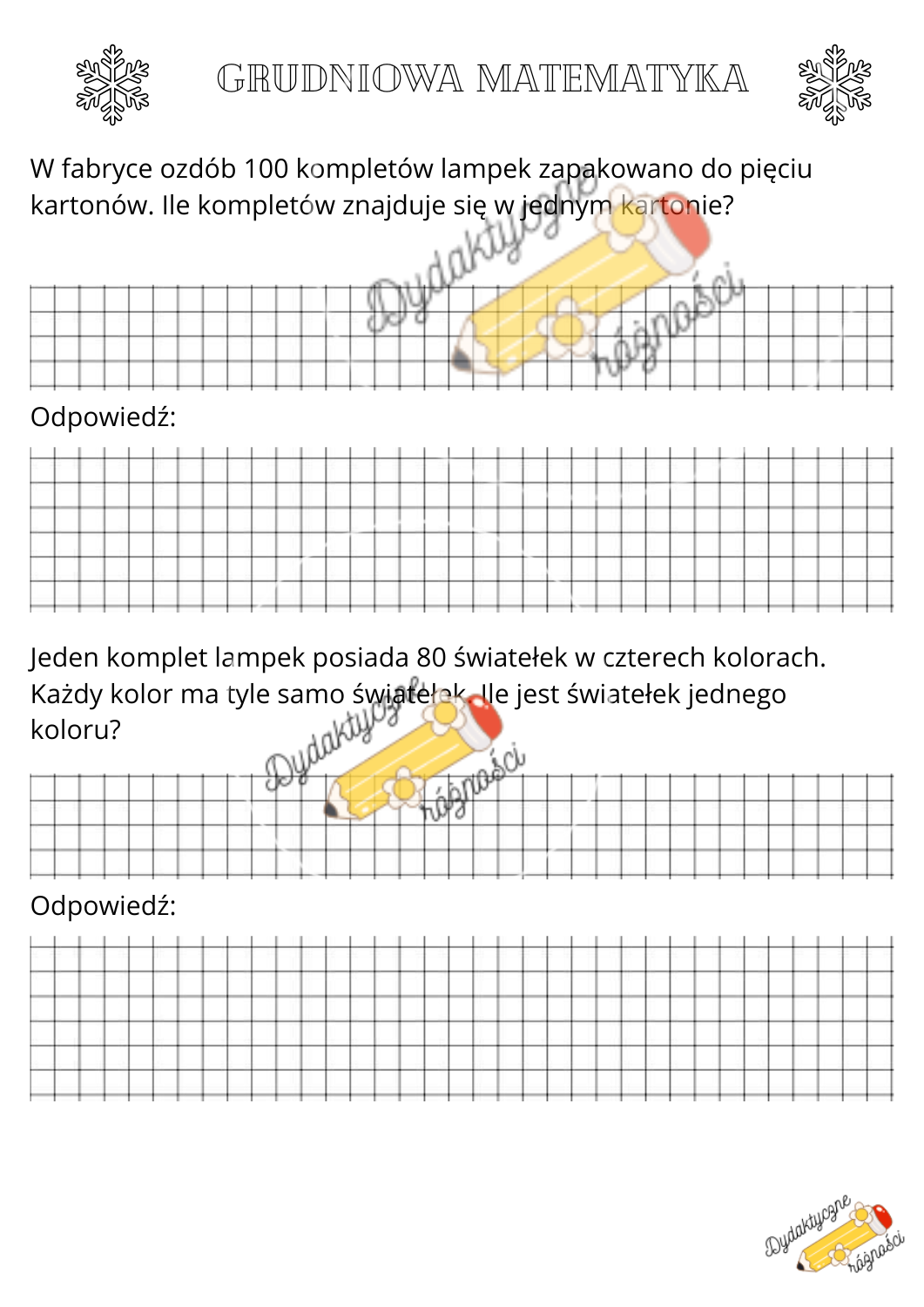 Materiał zawiera 5 kart pracy o tematyce światecznej z zadaniami tekstowymi dwuczłonowymi co daje 10 zadań. Obejmuje dzielenie w zakresie 100 .