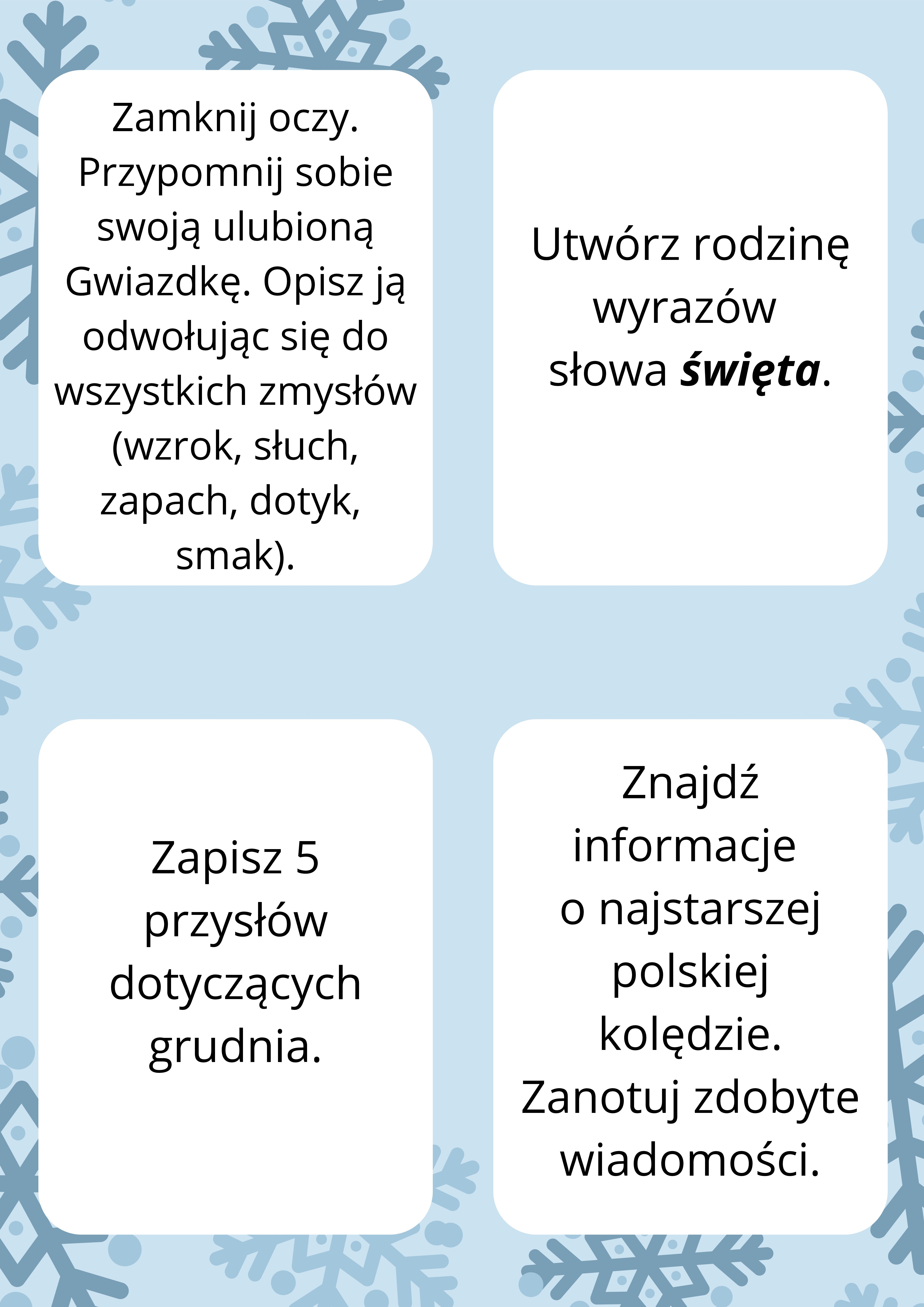 Materiał zbudowany jest na zasadzie kalendarza adwentowego i zawiera polonistyczne zagadki i polecenia związane ze świętami Bożego Narodzenia np. wybieranie prezentów dla postaci literackich, pisanie wierszyka o Mikołaju, przedstawienie przepisu na ulubioną potrawę świąteczną. Materiał zawiera 32 zadania (8 stron z czterema zadaniami); planszę/plakat; kartę zadań, na której zaznaczamy wykonanie zadania oraz spis grudniowych dni, w których pojawiać się będą zadania. Z bazy zadań można wybrać 16 (bo tyle jest dni pracujących w grudniu) lub zaproponować uczniom dwa zadania dziennie (do wyboru). W moim zamyśle wykorzystujemy tablicę na korytarzu szkolnym, na której codziennie wieszamy jedno (lub dwa) zadanie pod konkretną datą. Inspiracja: Sylwia Oszczyk, Marta Poniedziałek.