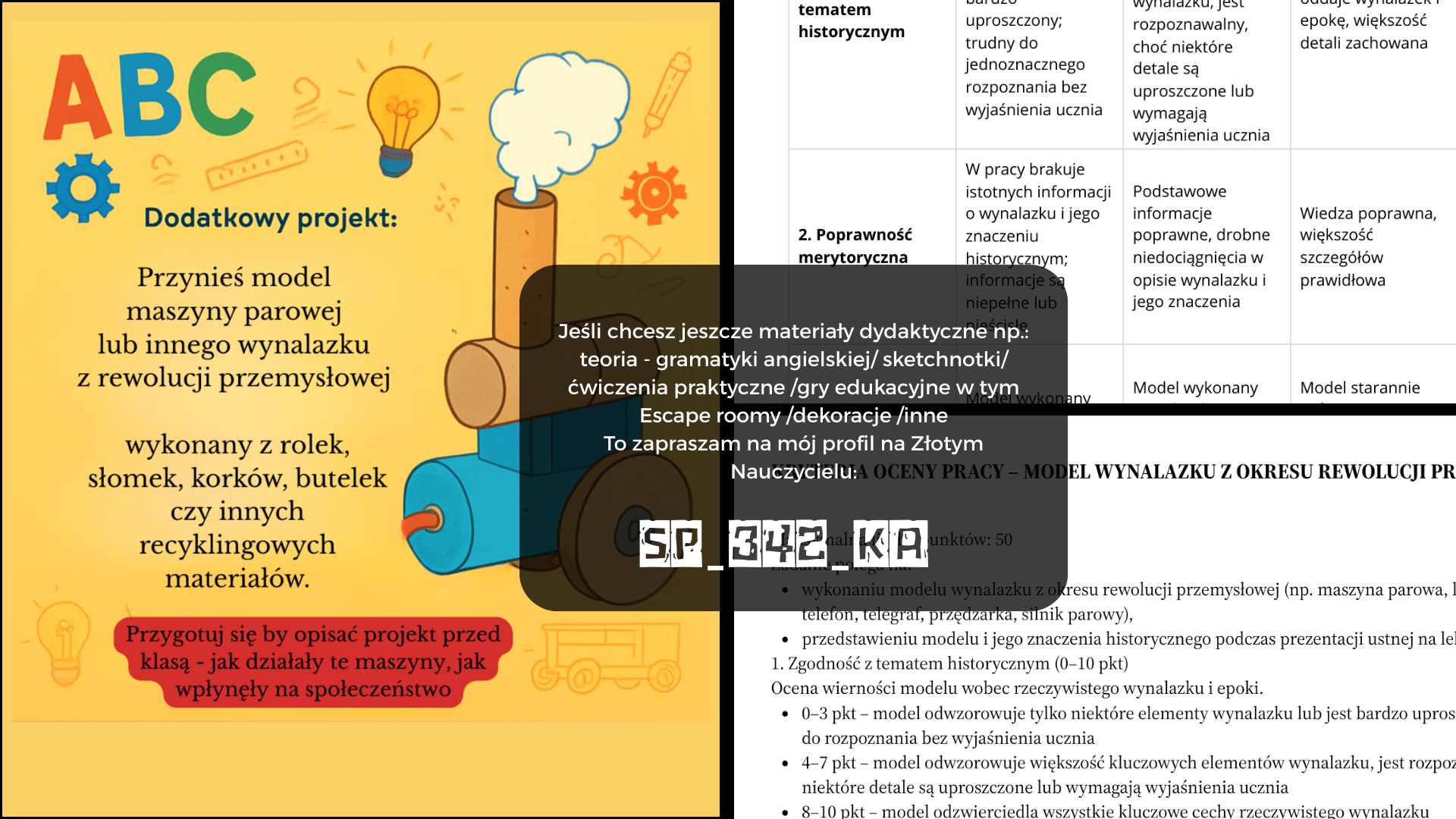 Karta do oceny pracy uczniów w projekcie makiety wynalazku z czasu rewolucji przemysłowej. Zawiera Kryteria oceniania, szablon oceny a także rubrykę oceny pracy ucznia. Dzięki czemu łatwo dać informacje zwrotną.
