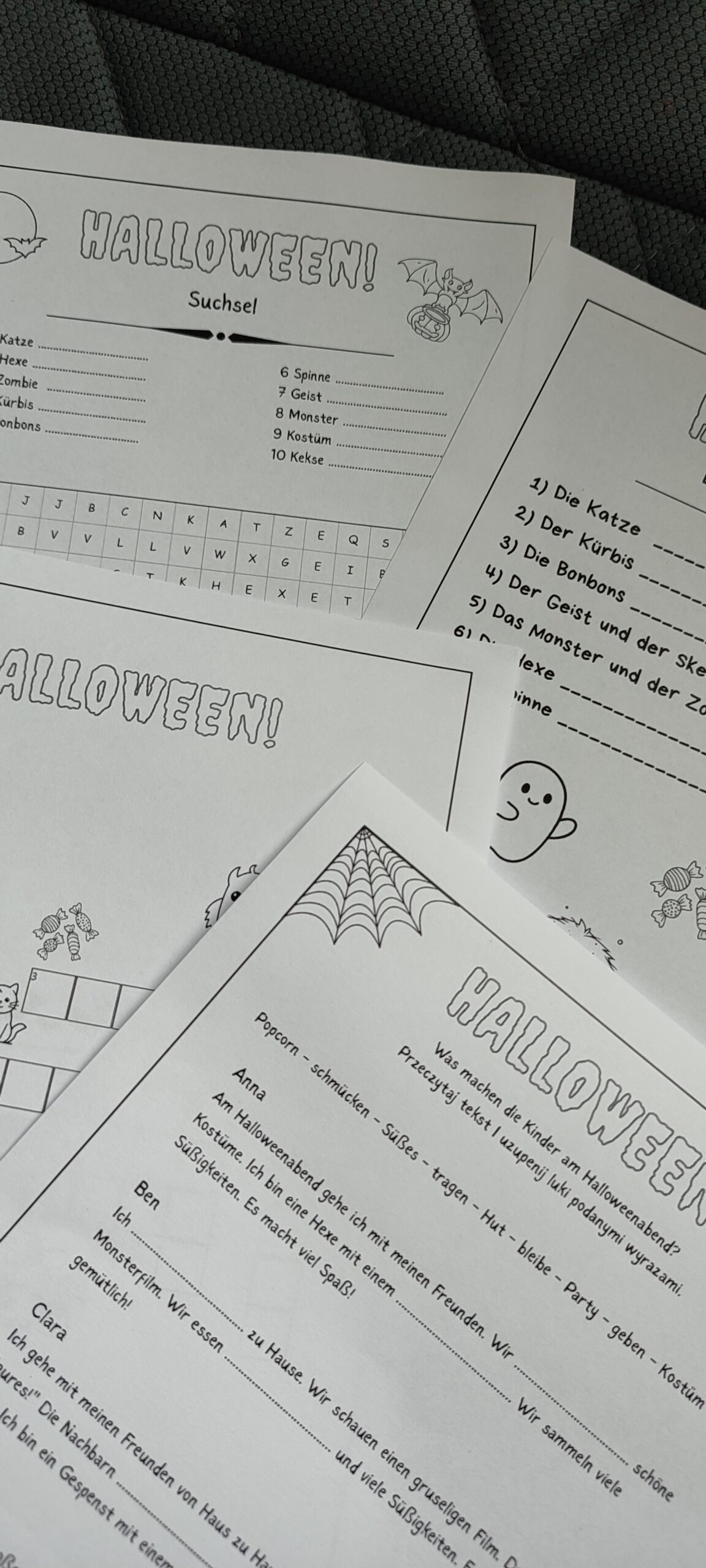 Strona 4 - Tekst poziom A1 do uzupełnienia podanymi słówkami. Tekst zawiera 5 krótkich wypowiedzi o tym jak dane osoby spędzają wieczór Halloween, co umożliwia szereg dalszych aktywności na ich podstawie (biegane dyktando, pytania do tekstów, własna wypowiedz, co wolisz?, itp).