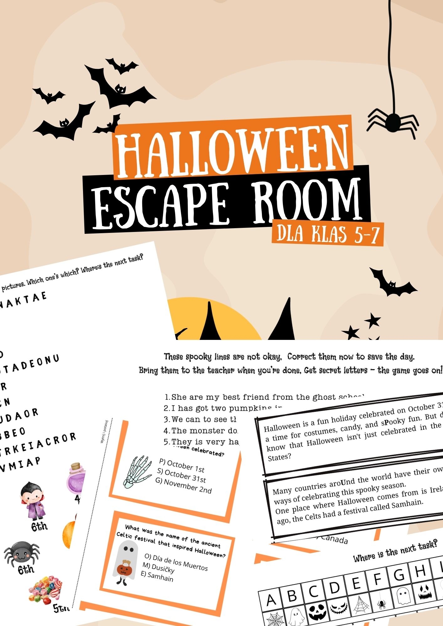 Halloween Escape Room dla klas 5-7 to zestaw 7 zadań dla uczniów szkoły podstawowej. Dla klas 5 mogą być wyzwaniem i wymagać wprowadzenia części słownictwa przed zajęciami.