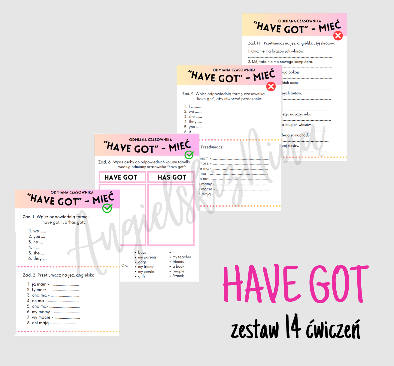 Zestaw 14 prostych ćwiczeń do utrwalenia odmiany czasownika „HAVE GOT” – „mieć” w kolorowej, nowoczesnej odsłonie.