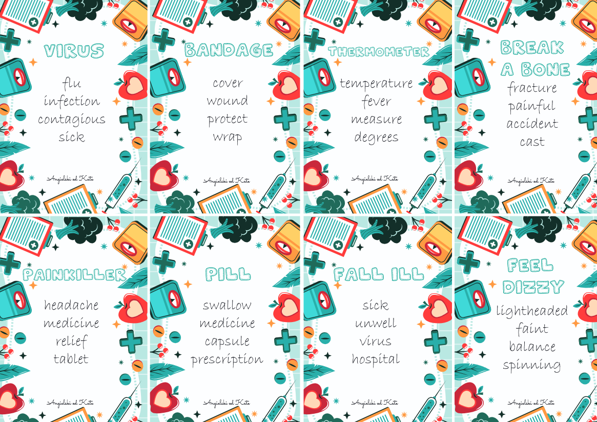 zawiera 72 hasła do ćwiczenia mówienia na lekcji języka angielkiego w miły i zabawny sposób o tematyce Zdrowia. Zawiera również tło. Poziomy A1-B2.