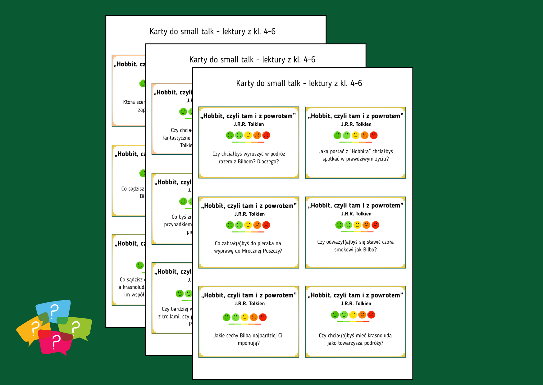 18 pytań typu „Karty small talk” do „Hobbita”. Takie pytania mają charakter swobodny, zachęcają do refleksji, rozmowy i dzielenia się opinią, a nie tylko sprawdzają wiedzę. Mogą być wykorzystywane na lekcjach jako forma integracji z lekturą lub podczas luźniejszych rozmów literackich. Dzięki nim można ćwiczyć wypowiedź argumentacyjną. Zasady: uczeń losuje kartę i odpowiada na pytanie (lub wszyscy uczniowie odpowiadają na to samo pytanie).
