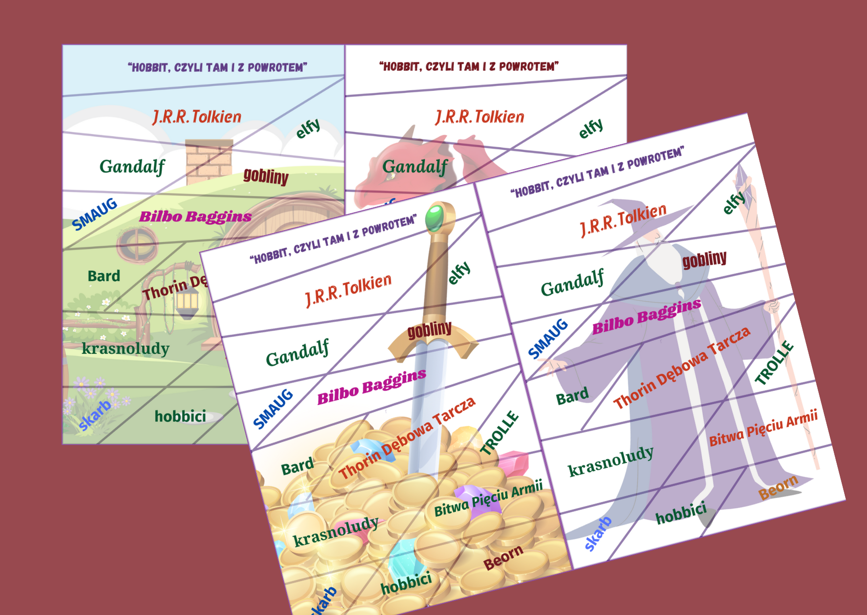 Na pozostałych moich aukcjach można zakupić inne materiały dotyczące „Hobbita”: plan wydarzeń do ułożenia, układankę dotyczącą bohaterów, ćwiczenia językowe i redakcyjne po omówieniu lektury, trimino, grę „5 sekund”, „prawda – fałsz” oraz „Ja mam, kto ma…”, krzyżówkę i wykreślankę, puzzle, ikonki, karty pracy, dooble, chmury wyrazowe itp.