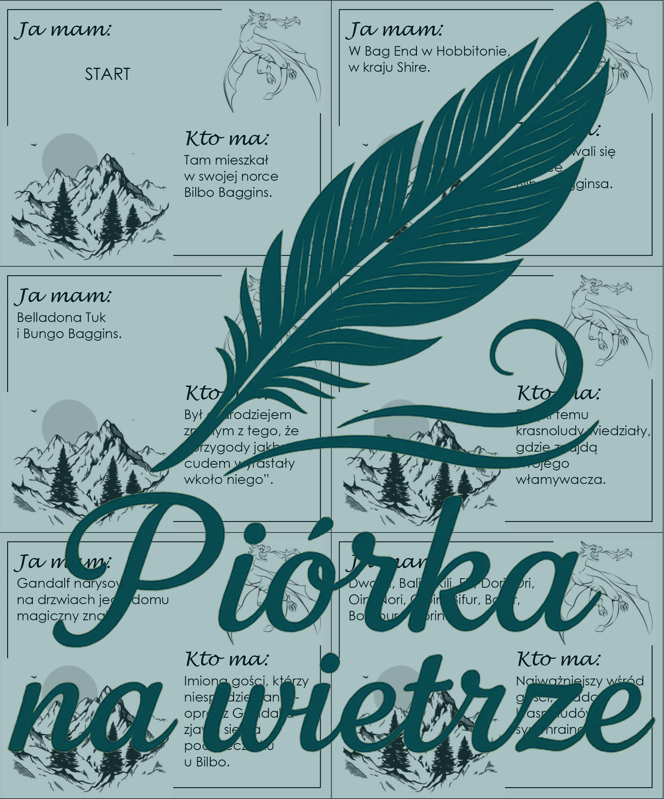 Zestaw 51 kart do gry „Ja mam… kto ma…” przygotowanych w oparciu o treść lektury „Hobbit”.