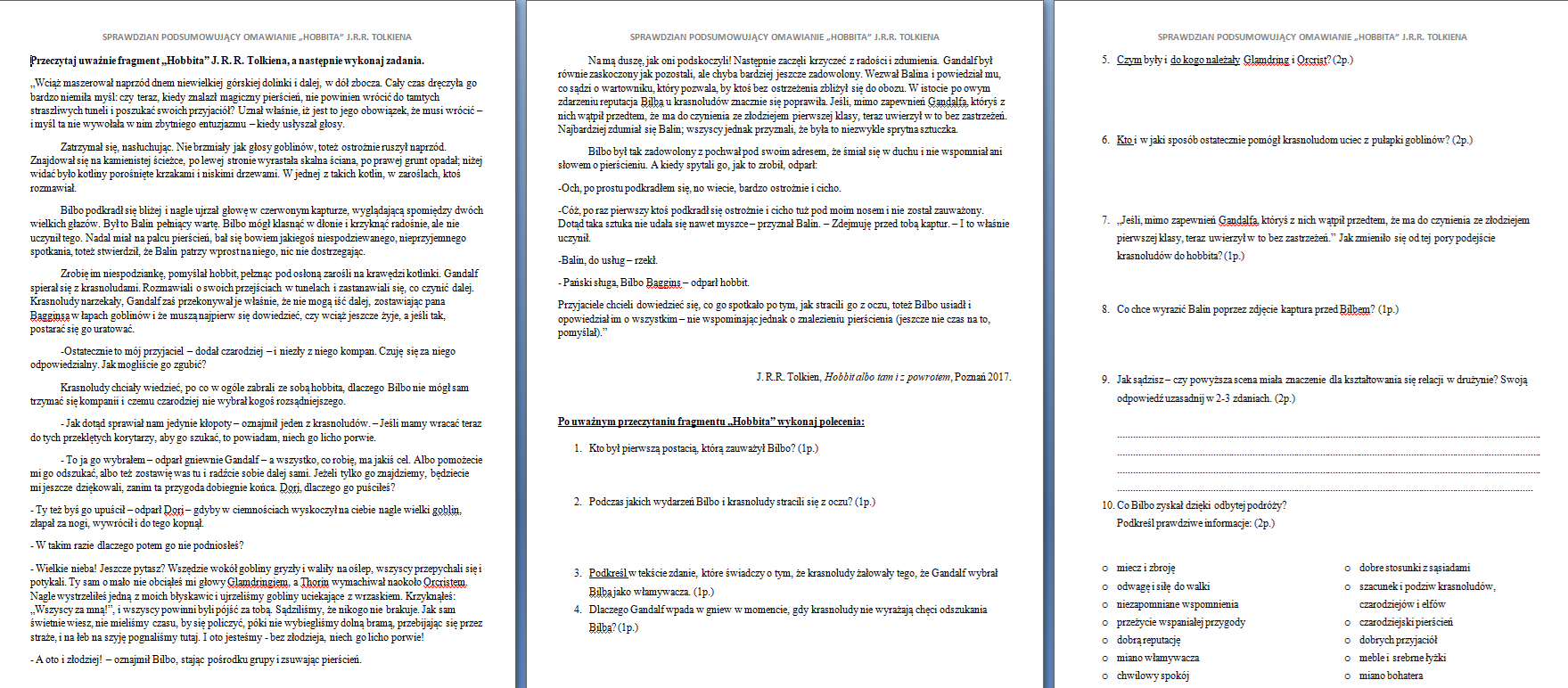 Ułożony przeze mnie sprawdzian jest dobrym zwieńczeniem omawiania lektury. Rozpoczyna się czytaniem ze zrozumieniem, zawiera różnorodne typy zadań, bez wypracowania końcowego. Przewidziany na pół godziny pracy, z możliwością wydłużenia czasu do 45 minut.