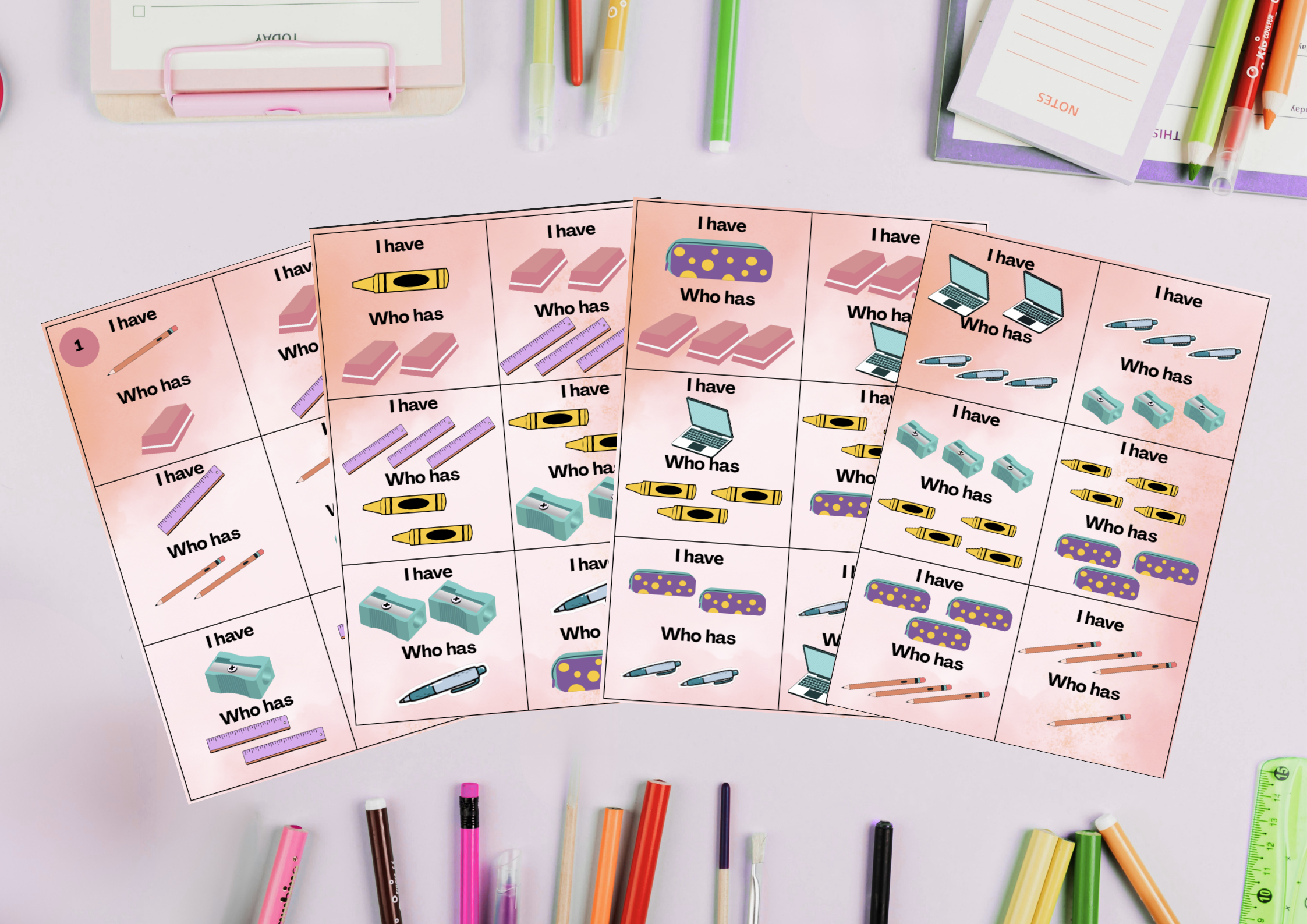 24 karty I have/ Who has na poćwiczenie nazw przedmiotów szkolnych oraz umiejętności tworzenia liczby mnogiej rzeczownika. Można zgarać na lekcji lub w domu. Do pobrania za darmo :)