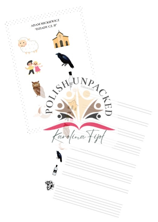 Praktyczny zestaw kart pracy dla ósmoklasistów, stworzony z myślą o skutecznym powtórzeniu najważniejszych treści i symboli z lektury „Dziady cz. II”.