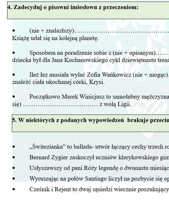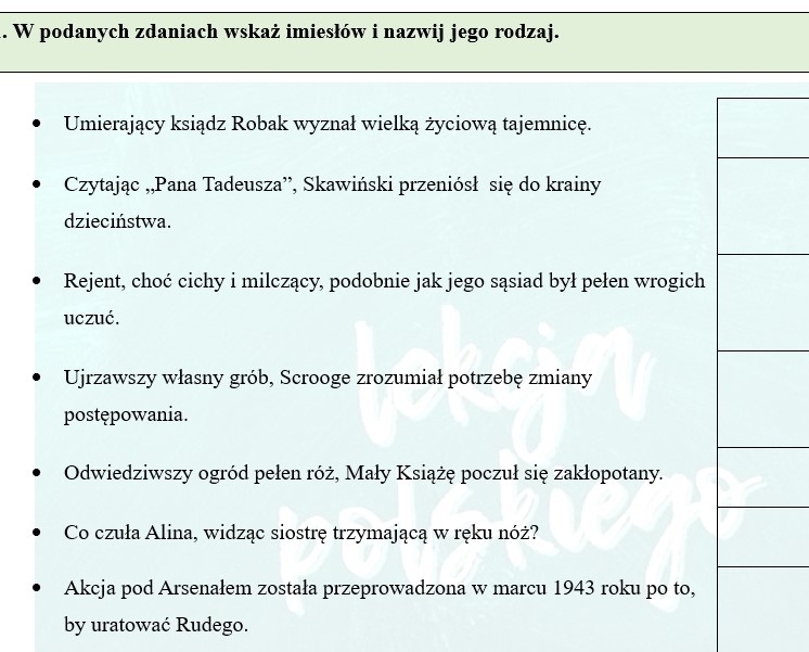 Pozwala połączyć przypomnienie zagadnień z zakresu nauki o języku (imiesłowy, ich rodzaje, interpunkcja w zapisie wypowiedzeń z imiesłowowym równoważnikiem zdania, pisownia z partykułą nie, poprawność użycia imiesłowów) z wiedzą o lekturowych bohaterach.