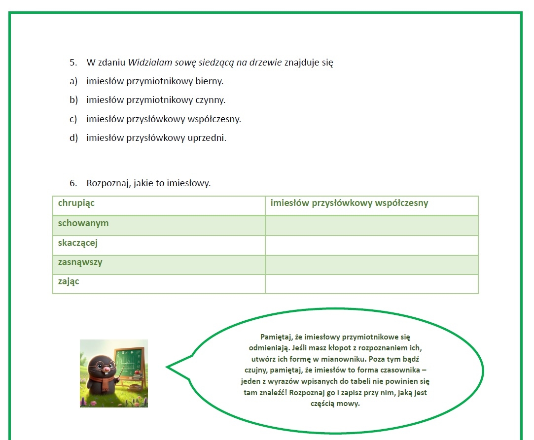 Zapraszam do zakupu materiału dotyczącego imiesłowów. Można w nim znaleźć powtórzenie najważniejszych informacji oraz zestaw zadań wraz z odpowiedziami - wszystko w towarzystwie przemiłych zwierzątek. Zachęcam do skorzystania!