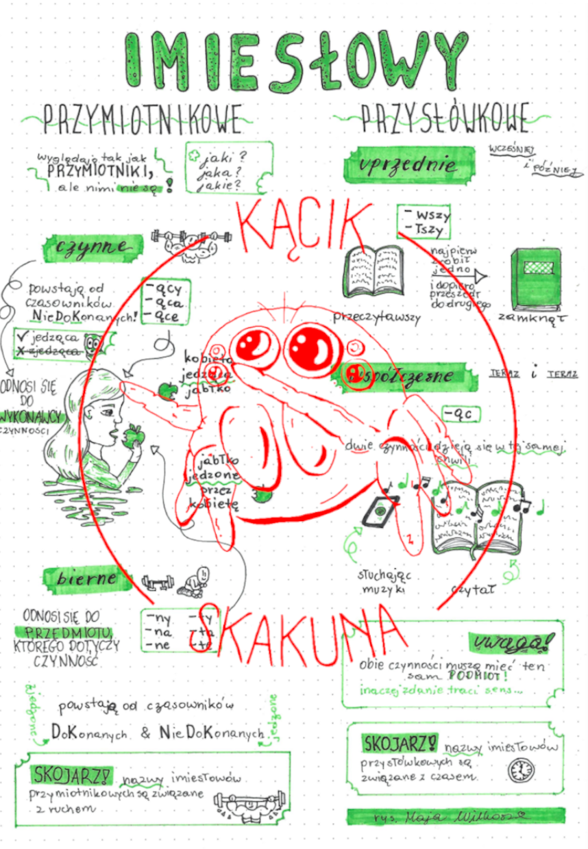 Rysnotka dotyczy typów imiesłowów, sposobów ich użycia oraz sposobów na łatwiejsze ich rozróżnienie razem z pomocnymi rysunkami.