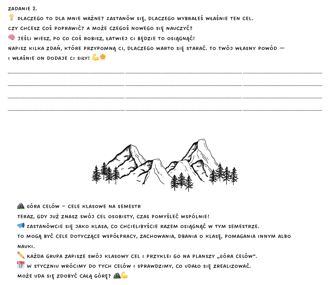 To kompletny materiał do wdrożenia innowacji pedagogicznej, która wspiera uczniów w rozwijaniu umiejętności planowania, wyznaczania celów, autorefleksji oraz współpracy. Innowacja trwa od września do maja i została zaprojektowana z myślą o nauczycielach wychowawcach pracujących z uczniami klas 4–7 szkoły podstawowej.