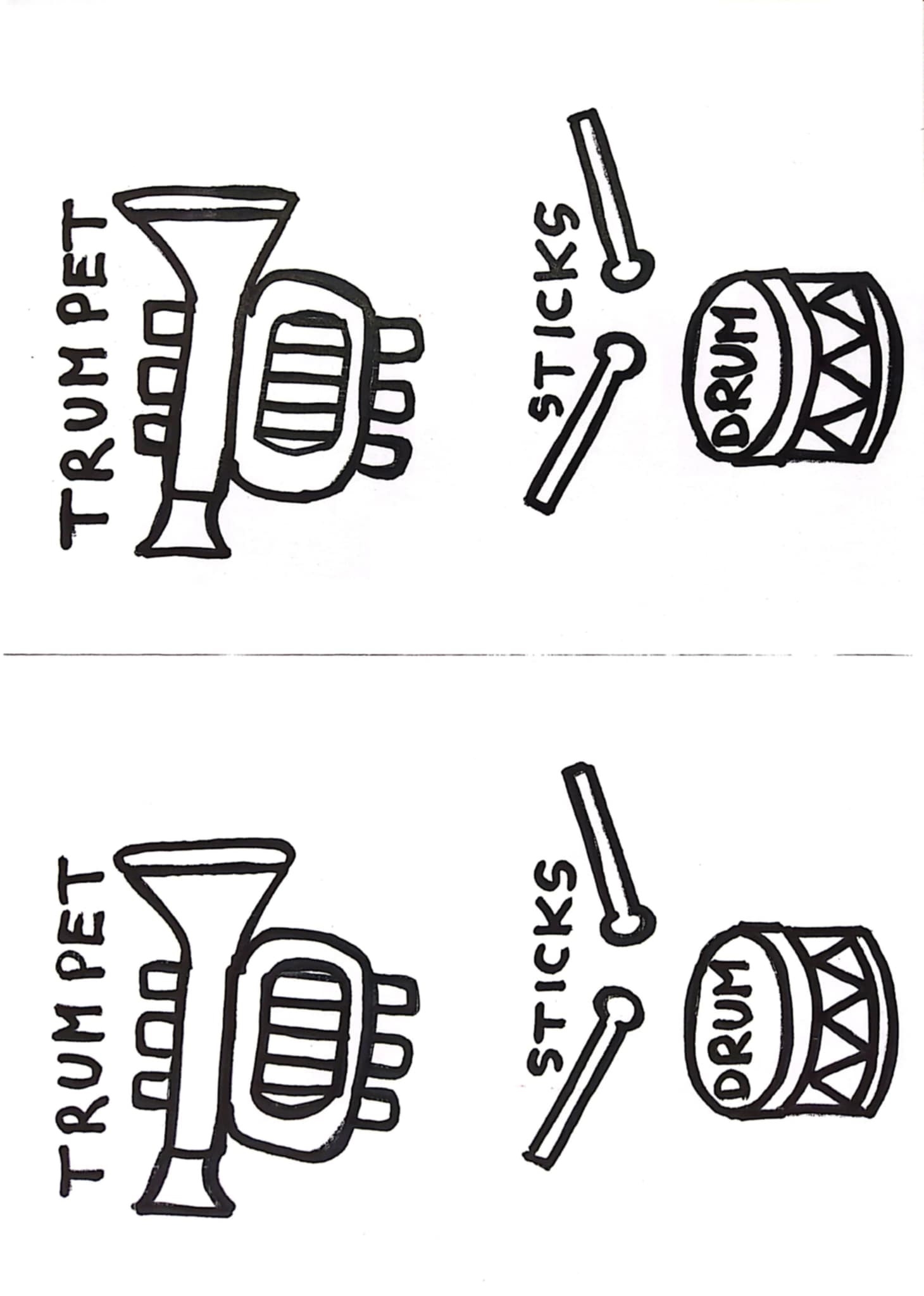 Instrumenty muzyczne - trąbka, pałeczki i bęben. Dobre jako ćwiczenie do piosenki "Oh when the saints go marchin' in".