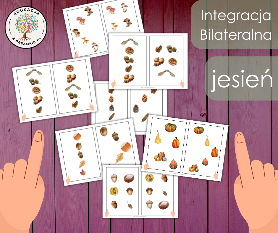 Zestaw zawiera 18 kart. Zadaniem dziecka jest znaleźć jednocześnie taki sam obrazek po lewej stronie kartki - lewą ręką oraz po prawej stronie karty - prawą ręką.