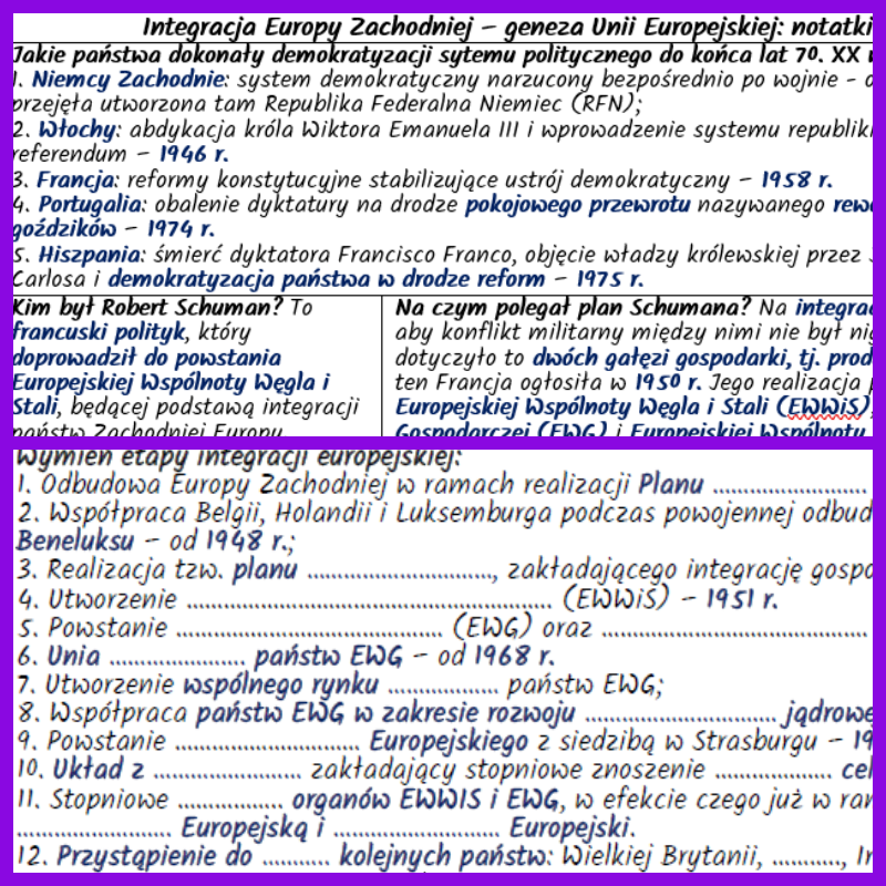 Notatki w formie pytań i odpowiedzi dotyczące zagadnienia stopniowej integracji gospodarczo-ekonomicznej państw Zachodniej Europy, skutkującej powstaniem Unii Europejskiej, przygotowane dla klasy 8 według podstawy programowej nauczania historii w szkole podstawowej (Podstawa programowa – Historia – Szkoła podstawowa IV-VIII) oraz utrwalająca wiedzę karta pracy zawierająca luki w treści wymagające uzupełnienia ustnego lub pisemnego.