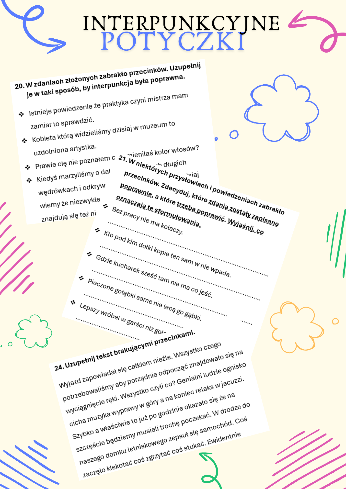 2. Interpunkcyjne potyczki - zestaw 24 zadań o rożnym poziomie trudności. Ćwiczenia obejmują zadania otwarte i zamknięte, związane ze wstawieniem przecinków, łączeniem dwóch zdań pojedynczych w złożone, wykorzystaniem odpowiednich spójników, sprawdzeniem interpunkcji całego tekstu, wyjaśnieniem różnic znaczeniowych, gdy przecinek znajduje się w wypowiedzeniu lub się nie pojawia, frazeologią.