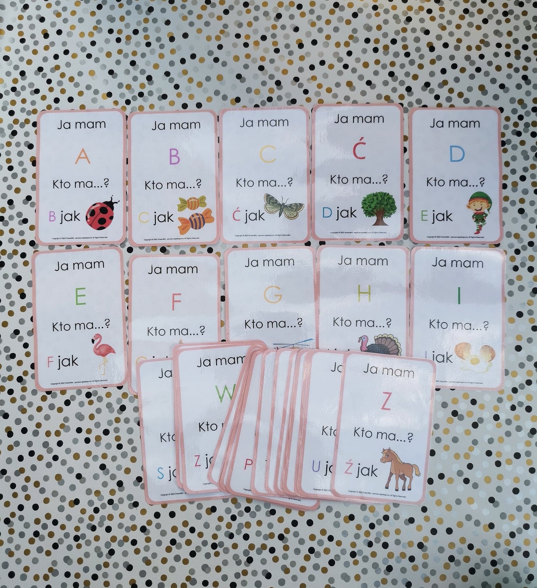 Każde dziecko biorące udział w zabawie otrzymuje kartę. Gracz rozpoczynający grę mówi jaką literkę ma a następnie zadaje pytanie "Kto ma..." literkę + obrazek rozpoczynający się na nią.
