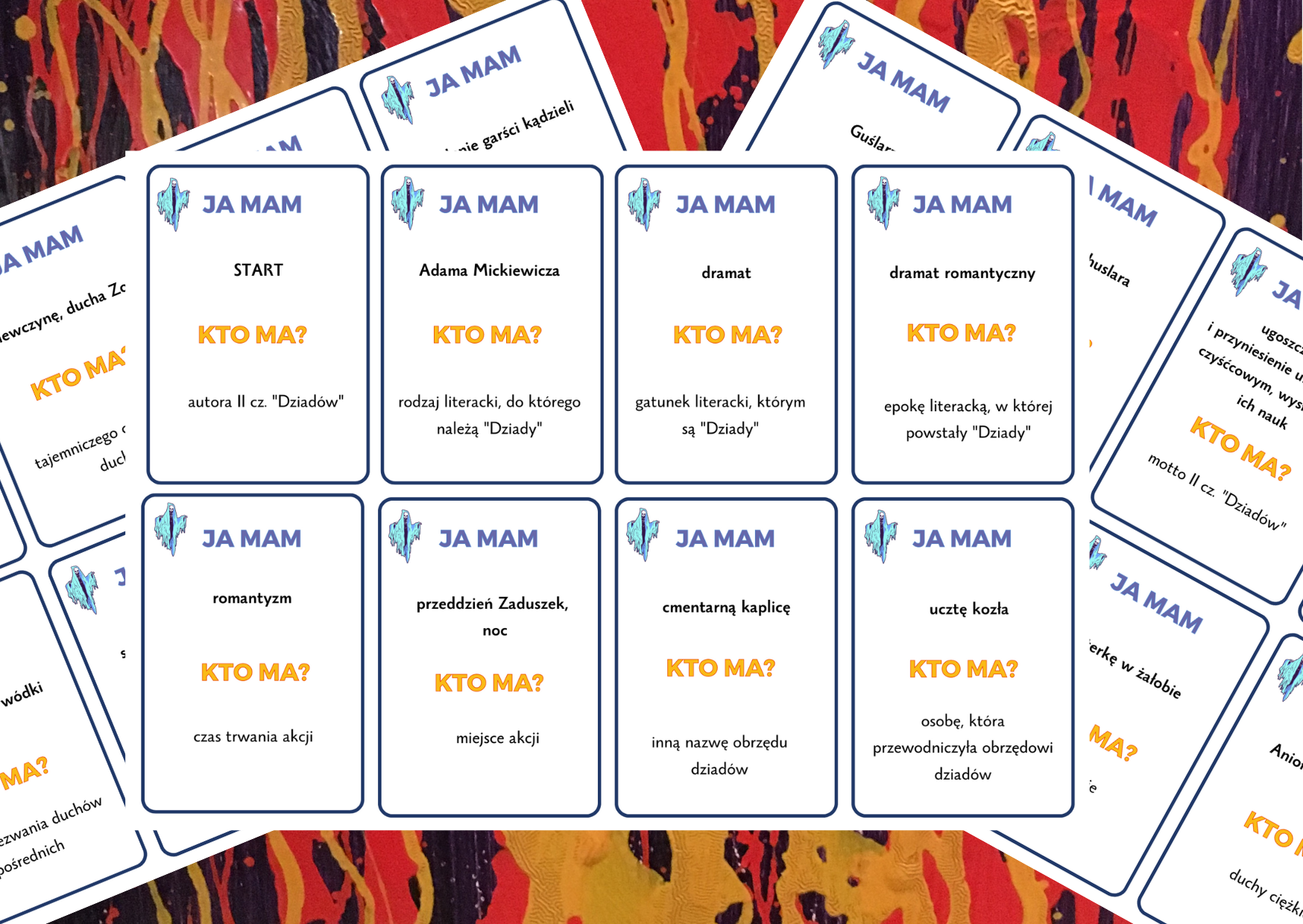 Zestaw 46 kart, dotyczących II części "Dziadów" A. Mickiewicza (6 stron A4 w formacie pdf), które po wydrukowaniu (można zalaminować, by dłużej posłużyły) trzeba wyciąć i rozdać losowo uczniom. Pierwszy uczeń zadaje pytanie: „Kto ma…”, osoba, która widzi na swojej karcie odpowiedź, podaje ją i czyta swoje pytanie.