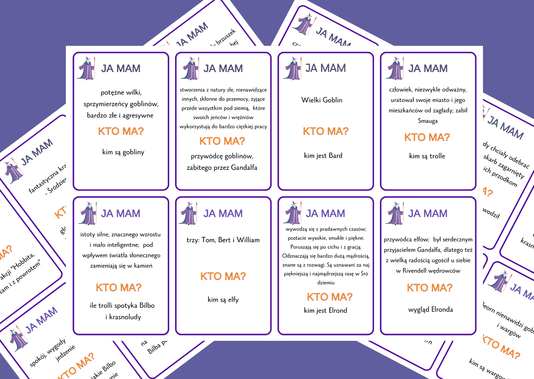 Zestaw 55 kart, dotyczących książki "Hobbit, czyli tam i z powrotem" (7 stron A4 w formacie pdf), które po wydrukowaniu (można zalaminować, by dłużej posłużyły) trzeba wyciąć i rozdać losowo uczniom. Pierwszy uczeń zadaje pytanie: „Kto ma…”, osoba, która widzi na swojej karcie odpowiedź, podaje ją i czyta swoje pytanie.