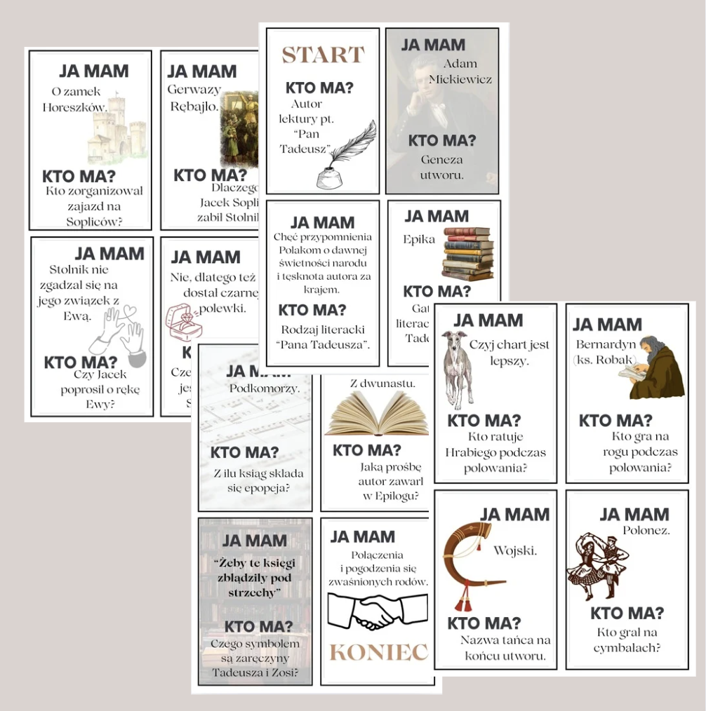 Gra zawiera 44 karty z pytaniami i odpowiedziami sprawdzającymi znajomość lektury obowiązkowej. Na stronie A4 mieszczą się 4 karty, jednak polecam wydrukować je 2na1, wtedy na kartce dostajemy 8 kart w wystarczającej wielkości. Karty świetnie sprawdzają się jako metoda sprawdzenia stopnia znajomości lektury, jak i jako podsumowanie pracy z książką. Na żywo karty można zobaczyć na moim profilu na IG: polonist_ka