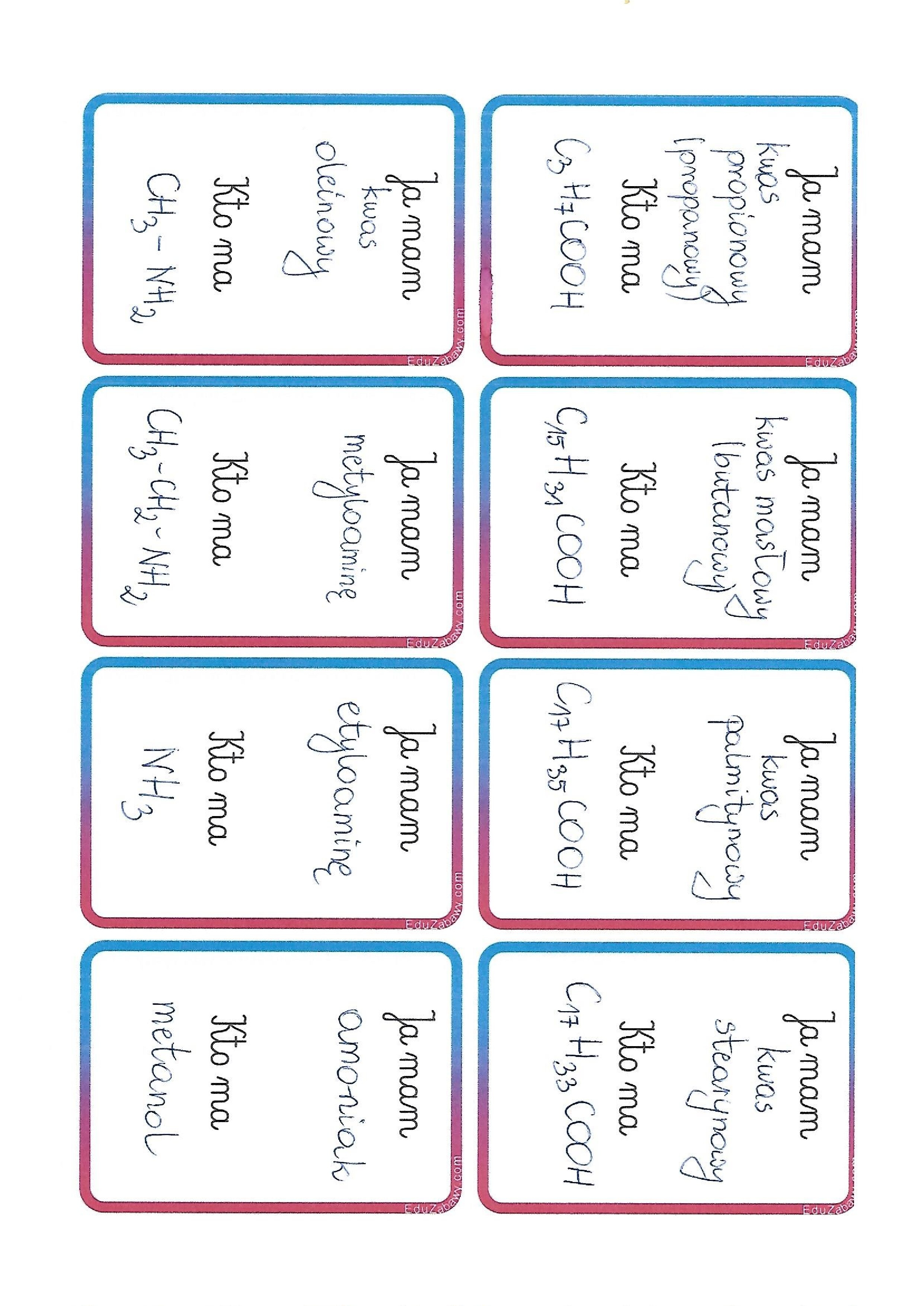Materiał zawiera 16 kart z nazwami i wzorami sumarycznymi pochodnych węglowodorów (alkohole mono- i poliwodorotlenowe, kwasy karboksylowe, kwasy tłuszczowe, aminy)